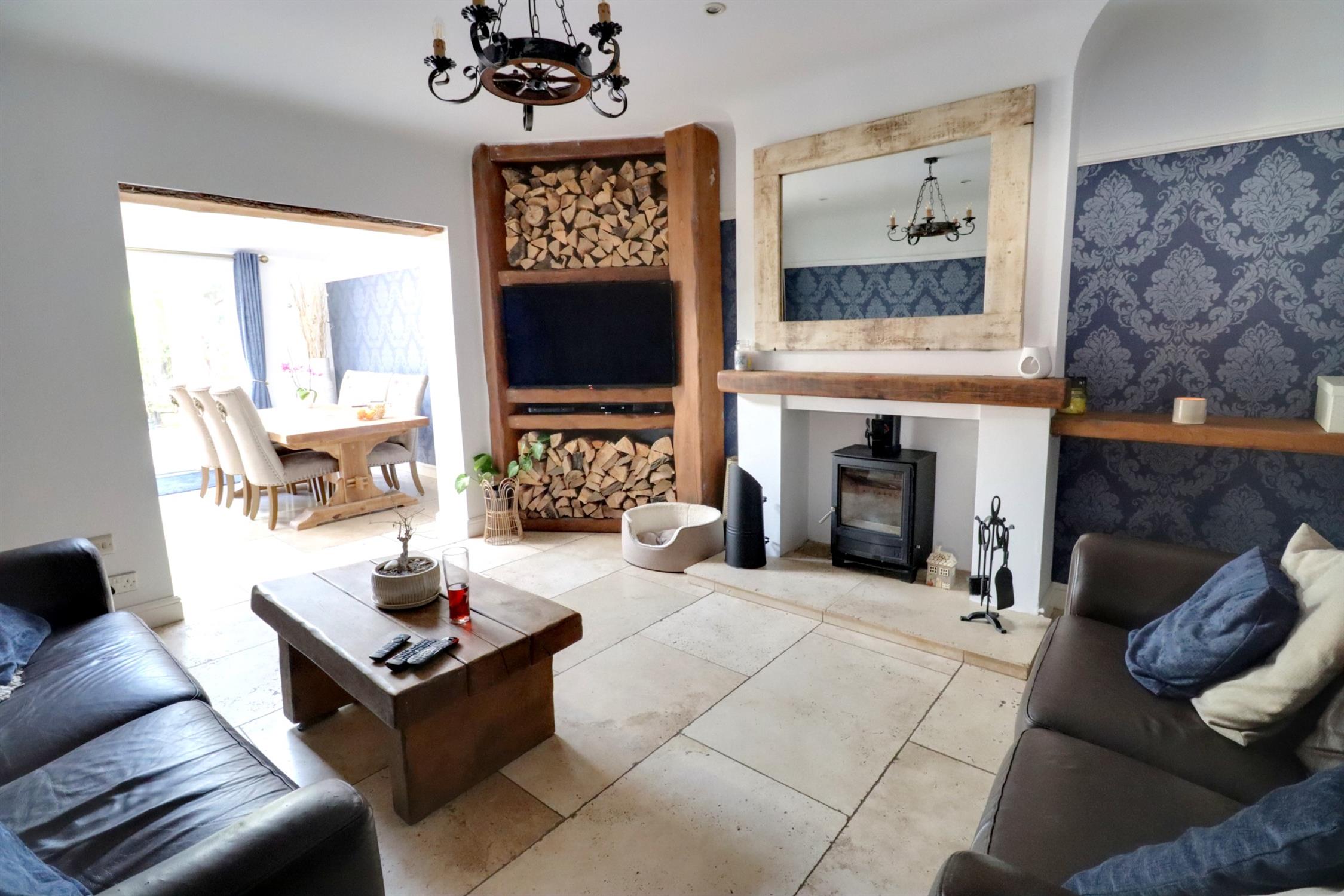 Limestone tiled flooring, tall radiator, wood burner with surround, built-in TV unit with wood store.