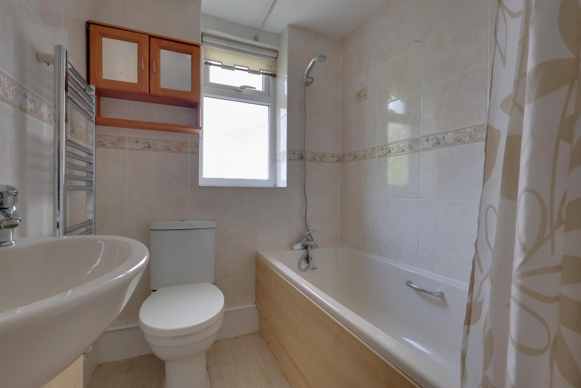 Obscured side window, panel bath with shower over, low-level WC, vanity wash hand basin, heated towel rail, radiator, and airing cupboard.