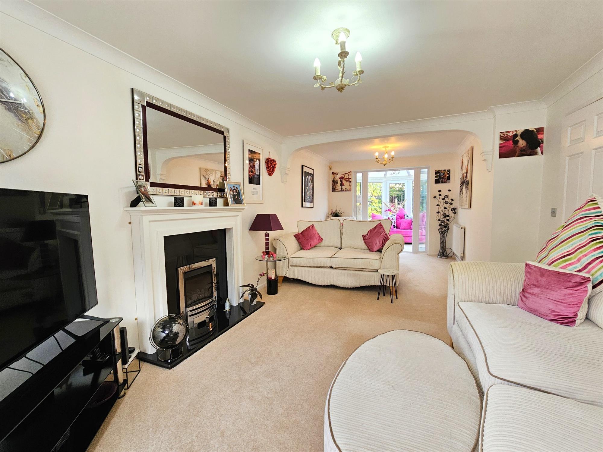 Smooth plastered ceiling, large bay window to front aspect. Gas coal effect fire in granite surround and hearth. Two Radiators. French doors leading to conservatory.