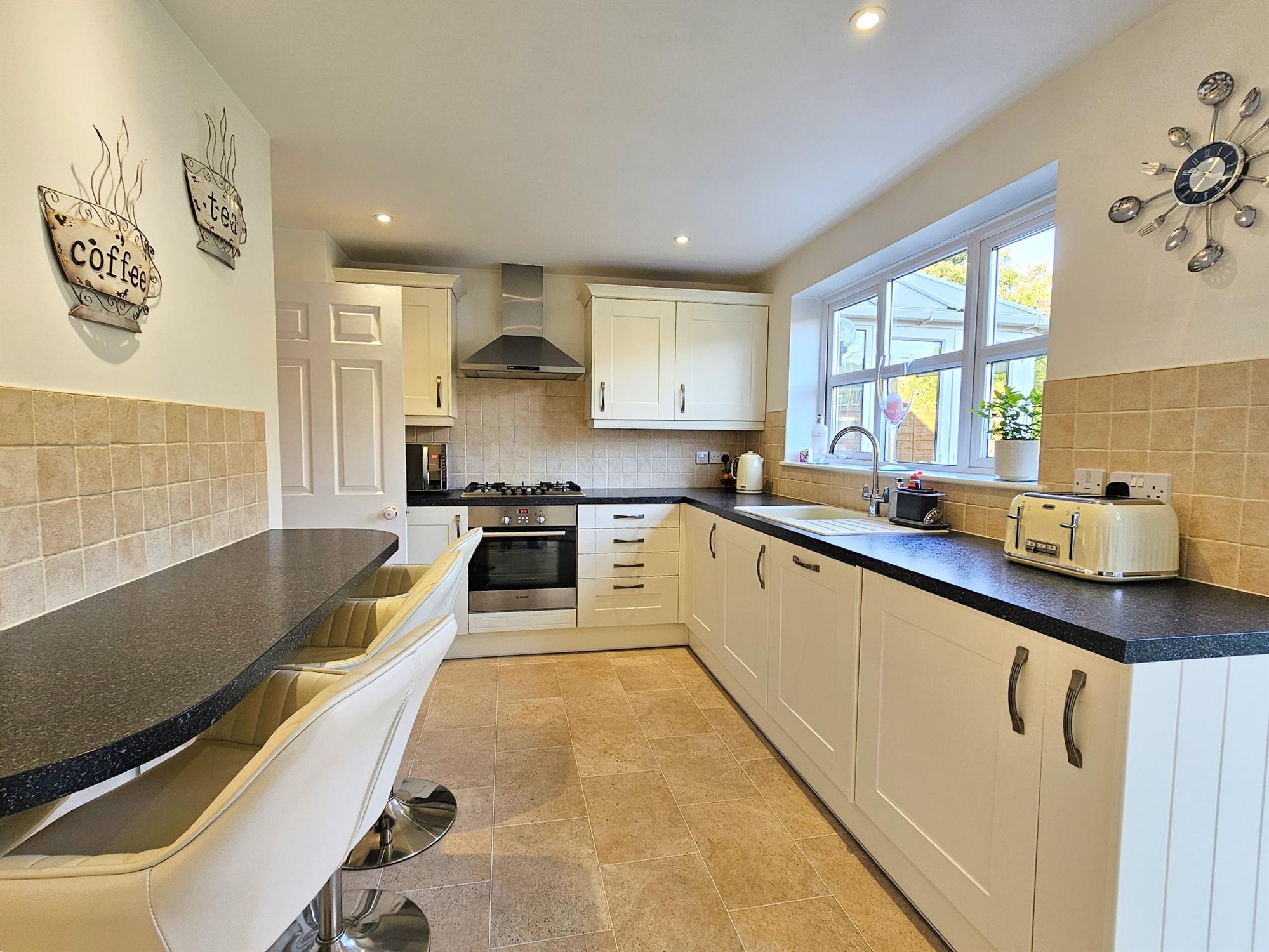 Smooth plastered ceiling with inset lighting. Upvc window with French doors to rear garden. Modern light coloured wall base and drawer units, sink/drainer set within contrasting worktops, tiled splash backs. Built in hob and integrated oven with hood over. Modern boiler housed in wall mounted cupboard. Integrated freezer, dishwasher and washing machine. Breakfast bar with stools. Karndean flooring throughout. Open to: