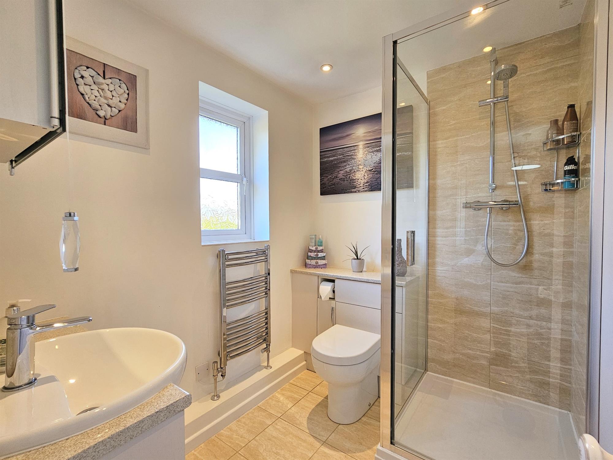 Smooth plastered ceiling with inset lighting. Obscured double glazed window to side aspect. Suite comprises shower cubicle with glass door, tiled walls, close coupled Wc with concealed cistern. Hand basin with store cupboard under and illuminated mirror over. Tiled floor with underfloor heating.