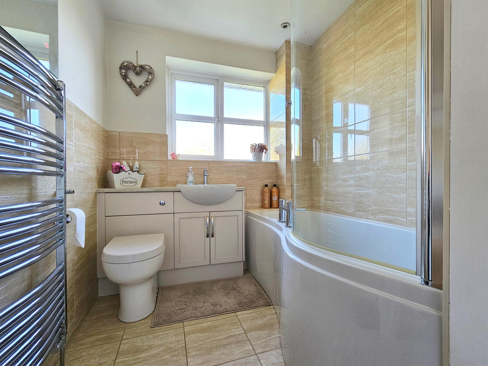 Smooth plastered ceiling with inset lighting. Obscured double glazed window to rear aspect. Suite comprises of a P shaped bath with shower over and glass screen, close coupled Wc with concealed cistern. Hand basin with cupboards under. Ladder style heated towel rail with illuminated mirror over. Shelved airing cupboard. Tiled flooring with underfloor heating.