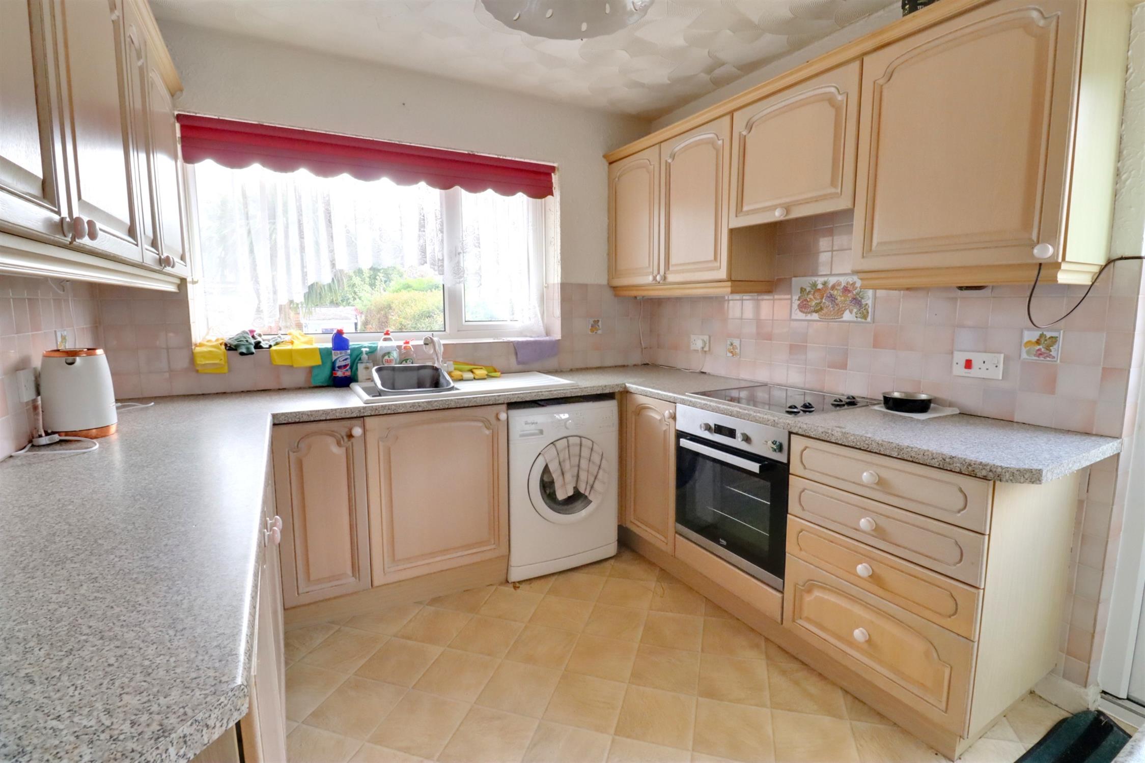 Fitted with a range of wall and base units with work surfaces over, integral electric oven and hob with extractor hood over, integral fridge and freezer, space for washing machine, single sink and drainer, cupboard housing the boiler, rear aspect double glazed window, side aspect double glazed door.