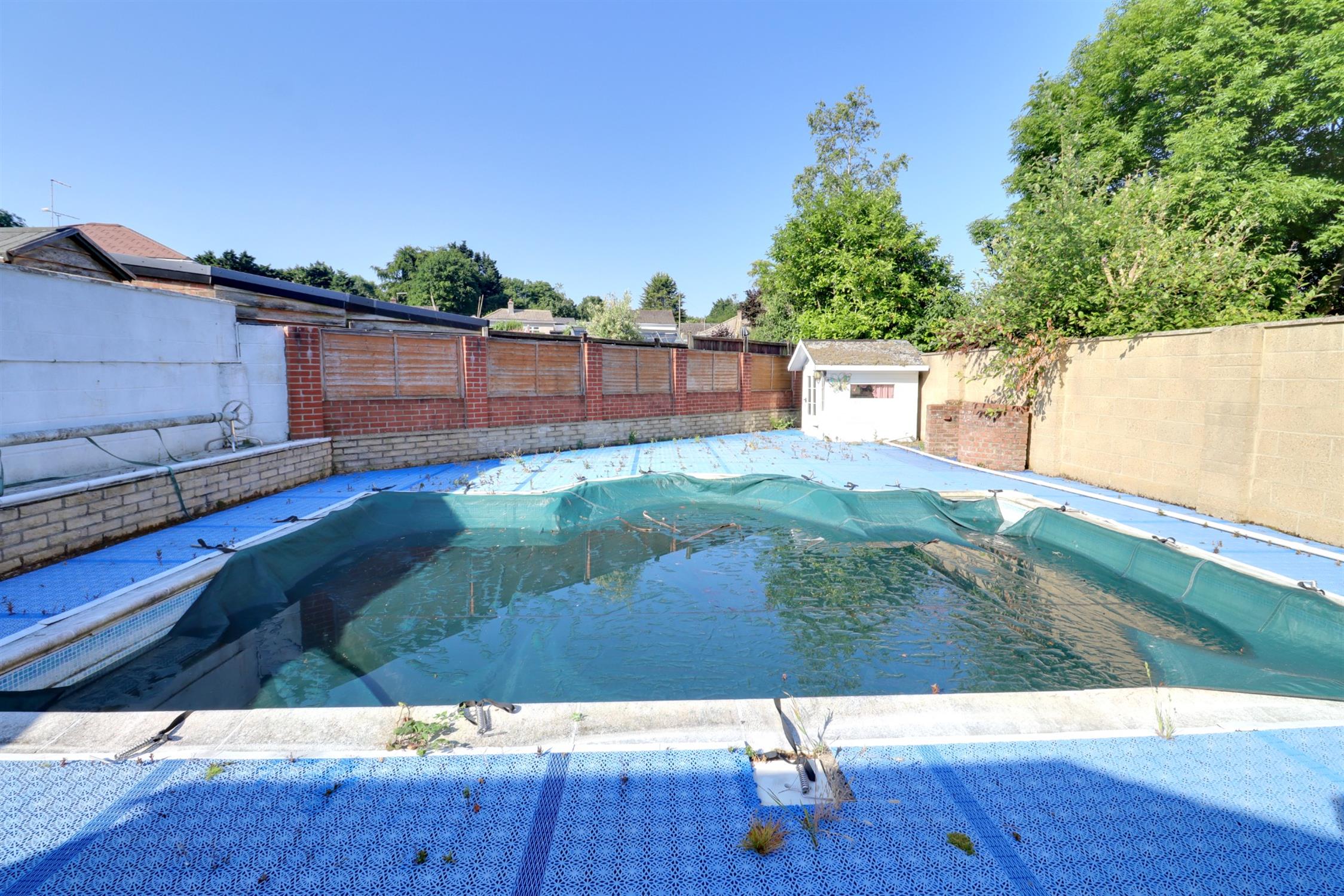 Enclosed by fence, lawn with borders, summer house, retractable awning, steps leading down to the swimming pool with ample seating areas surrounding, further shed housing the filtration unit for the pool, brick built BBQ.