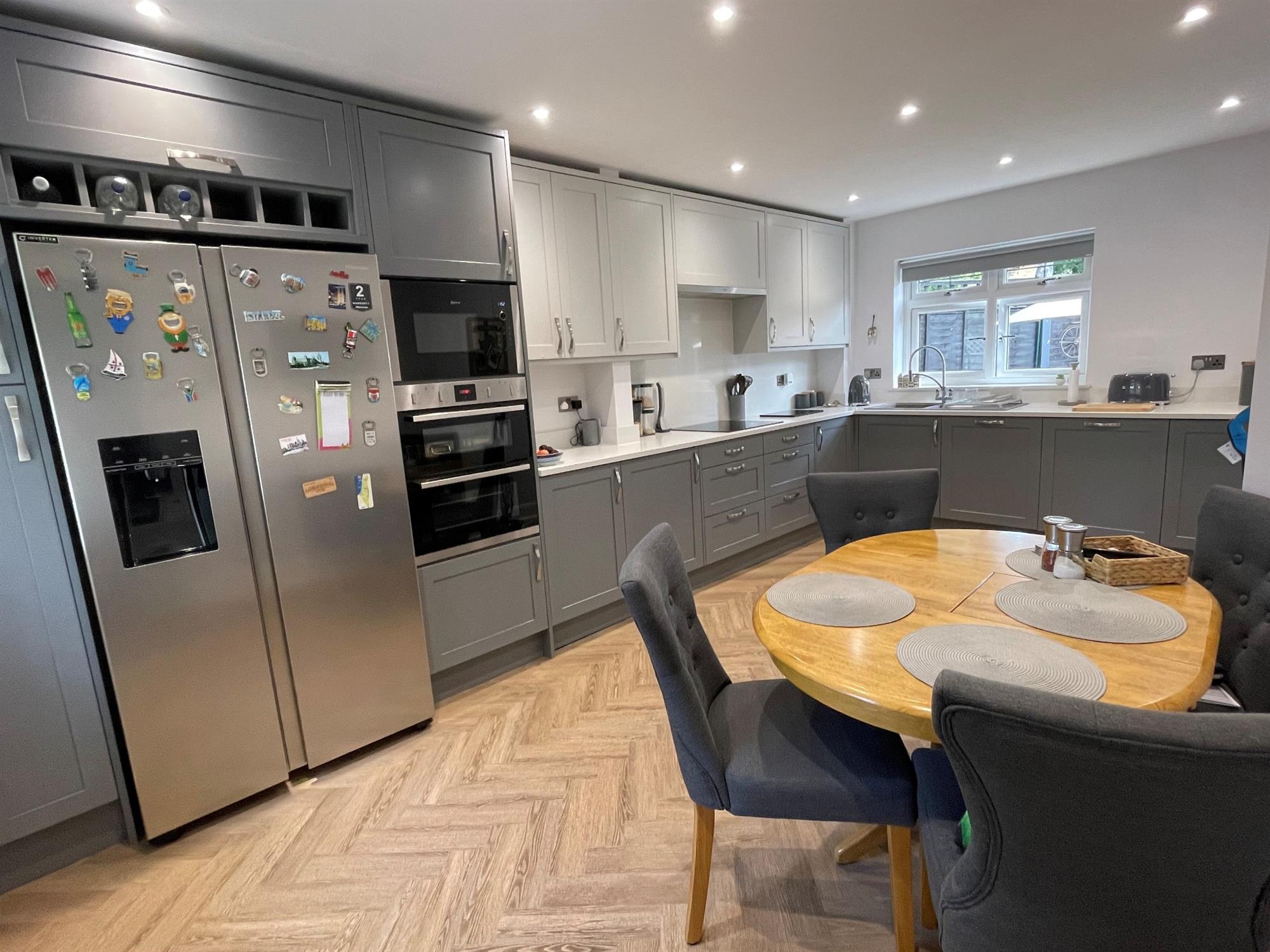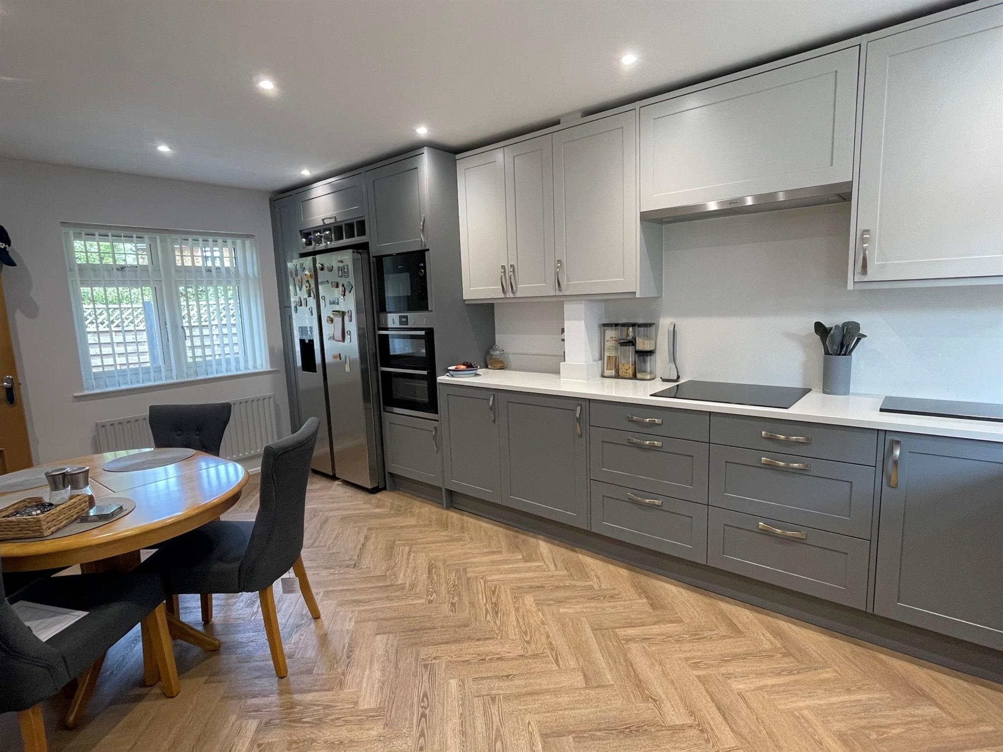 Windows to front and rear. Refitted with a comprehensive range of wall and base units with granite work surfaces over. One and a half bowl sink unit with mixer tap. Integrated hob with extractor over. Built in electric double oven and microwave. Space for American fridge freezer. Larder cupboard housing tumble dryer. Two radiators. Door into garden. Door into lounge.