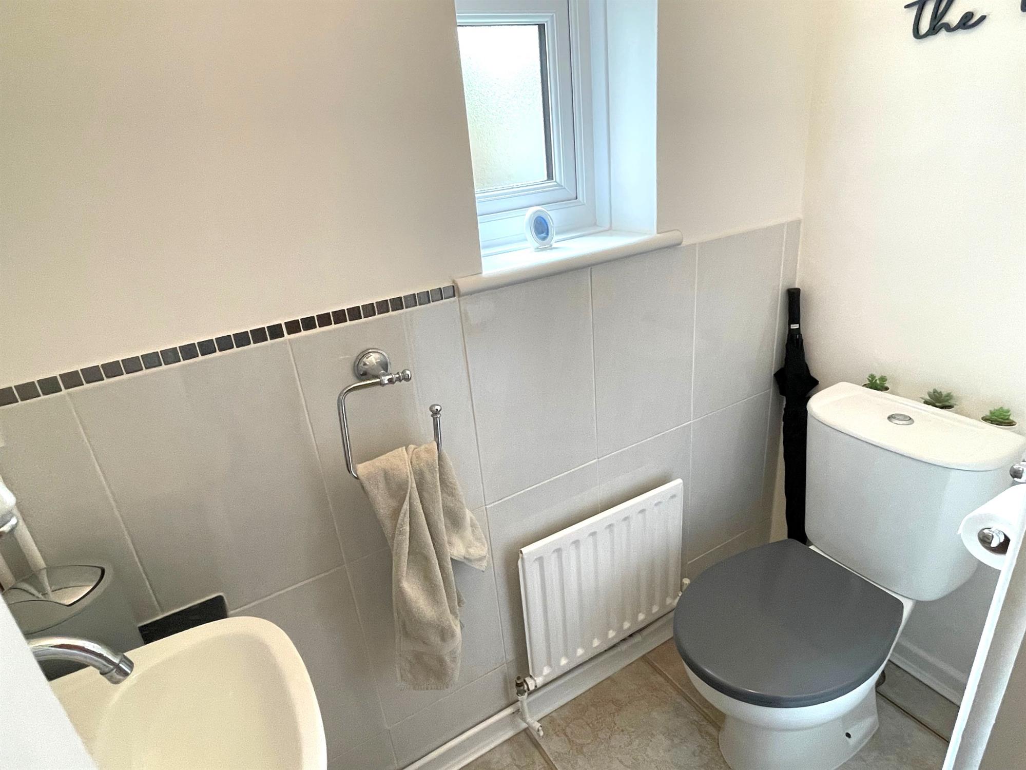 Obscure glazed window to side. Low level WC. Wash hand basin with cupboard below. Complementary tiling. Radiator.