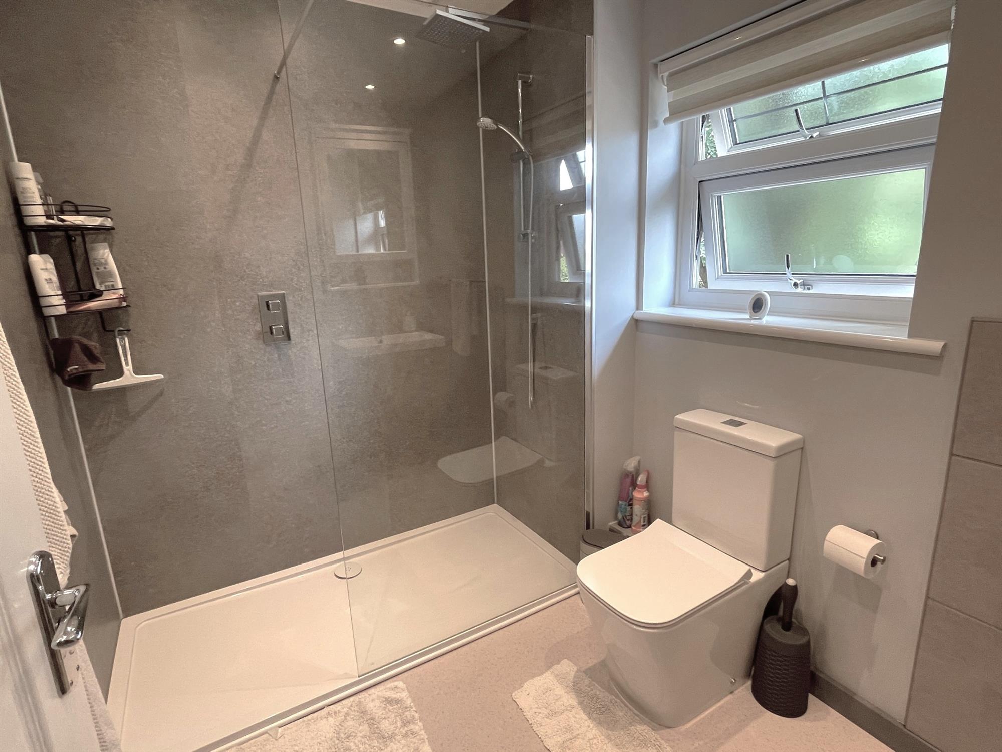 Window to rear. Double walk-in shower unit with glazed screen. Low level WC. Inset wash hand basin with drawers below. Complementary tiling. Heated towel radiator.