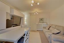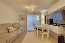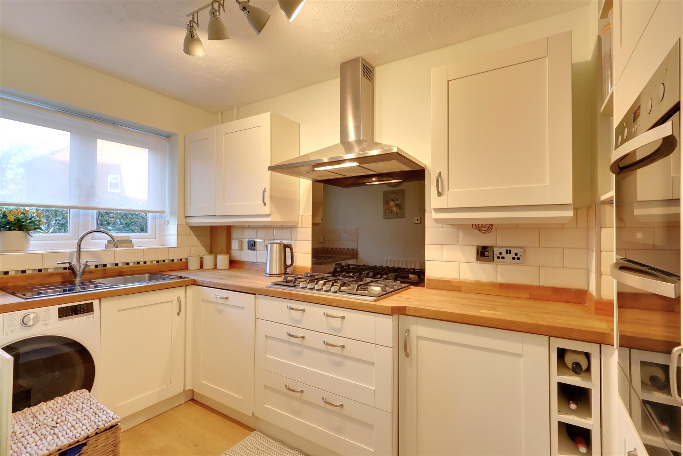 Textured ceiling. UPVC window to front aspect. Radiator. Range of modern, light coloured fitted wall, floor and drawer units. Wall mounted gas boiler housed in cupboard. Built-in appliances include double oven, stainless steel five ring gas hob with splashback and stainless steel extractor hood over, fridge freezer and integrated dishwasher. Space and plumbing for washing machine. Oak style wooden floor.