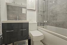Modern suite comprising panelled bath with central mixer tap, wall mounted shower controls with fixed rainfall style showerhead and additional detachable head. Tiled walls. Close coupled WC, wash handbasin with storage cupboards under. Ladder style heated towel rail.