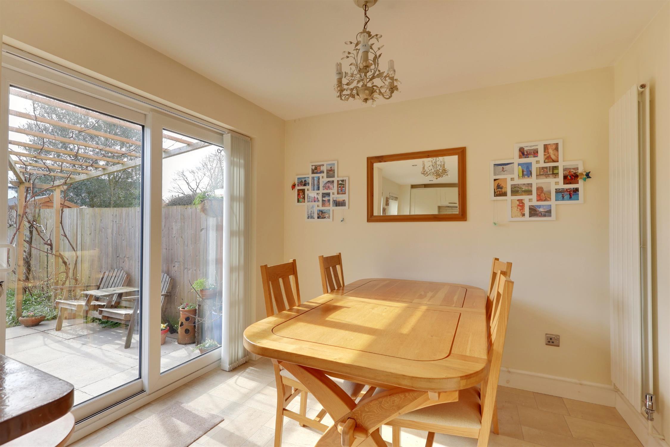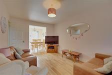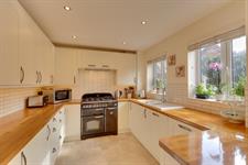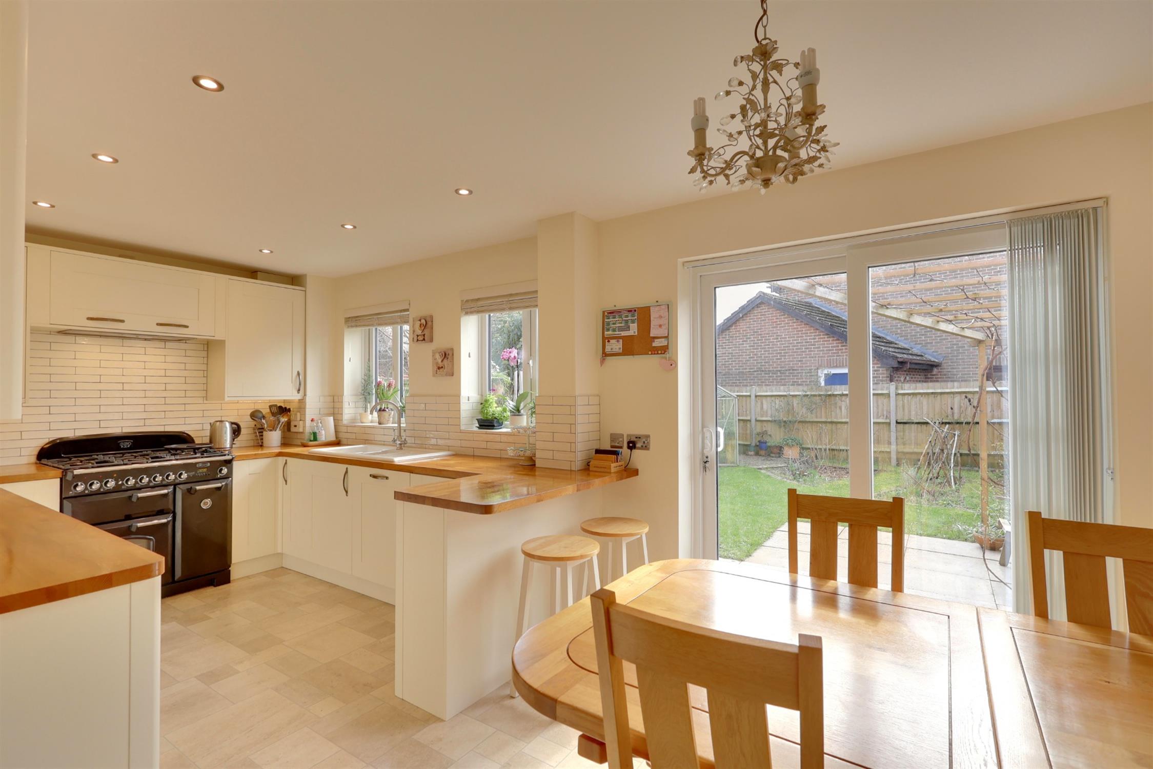 Smooth plastered ceiling with inset lighting. Two uPVC windows to rear aspect. Patio doors leading to rear patio. Vertical style radiator. Range of modern, light coloured wall and floor cupboards with drawer units. Space for gas range style cooker with extractor above. Tiled splashback. Integrated appliances include dishwasher, separate under counter fridge and freezer. One and a half sink/drainer with central mixer tap set into solid wood worktop.