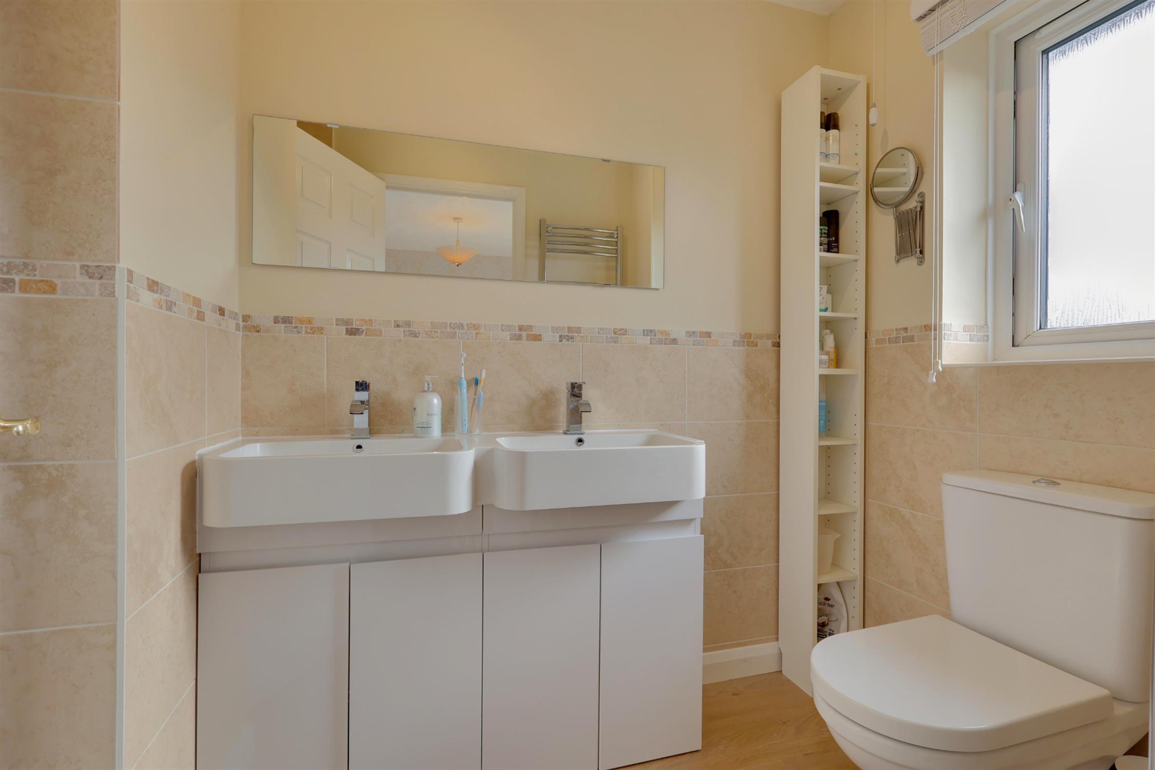 Textured ceiling with integrated extractor fan. Obscured uPVC window to rear aspect. Close coupled WC. Twin wash handbasins with storage cupboards under. Separate shower cubicle with wall mounted shower controls. Tiled walls, Oak style laminate flooring. Ladder style heated towel rail.