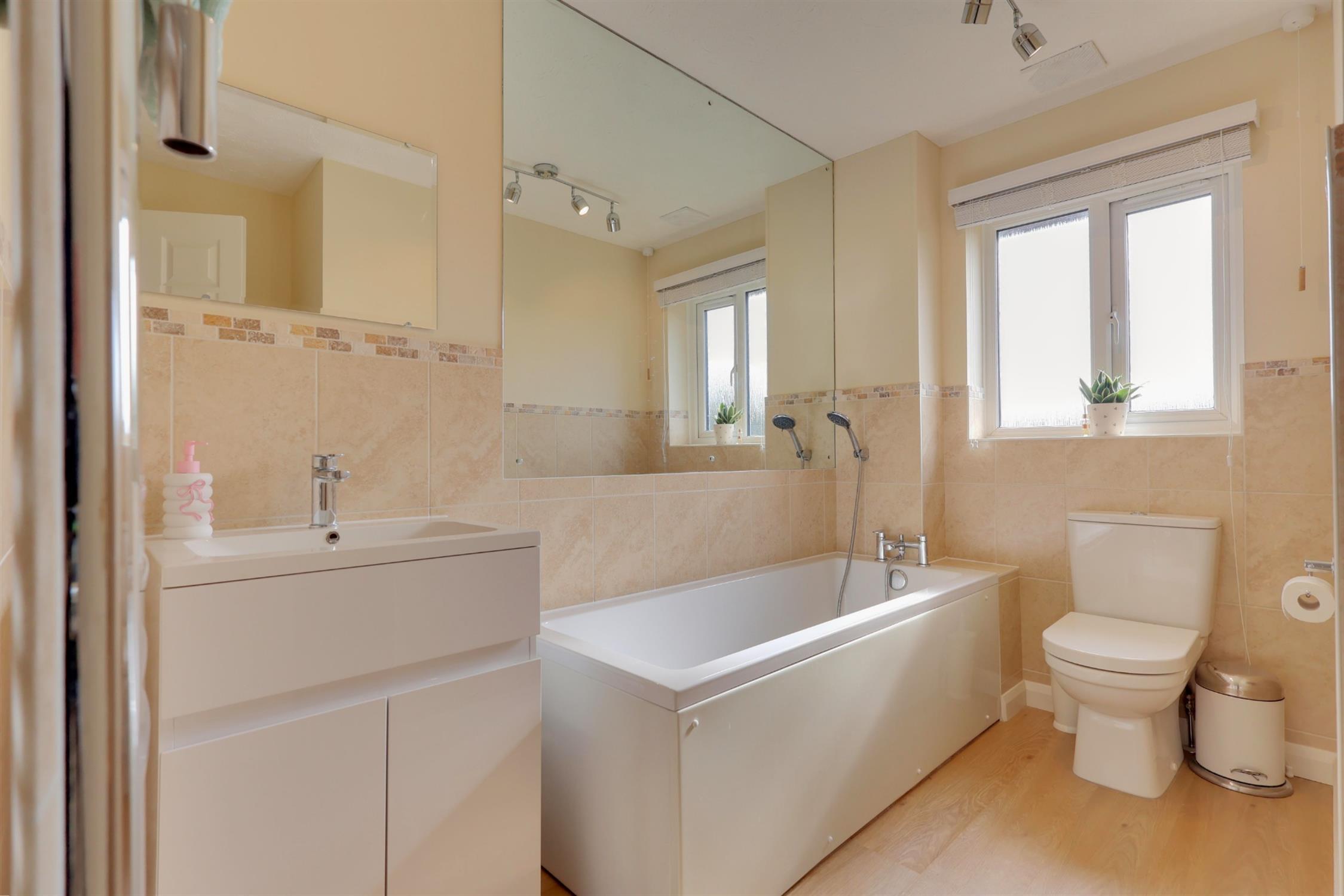 Textured ceiling. Frosted uPVC window to rear aspect. Close coupled WC, panelled bath with central mixer tap and shower attachment. Wash handbasin with storage drawer and cupboards under. Ladder style heated towel rail. Under floor heating with wall control. Half tiled walls and oak style laminate flooring.