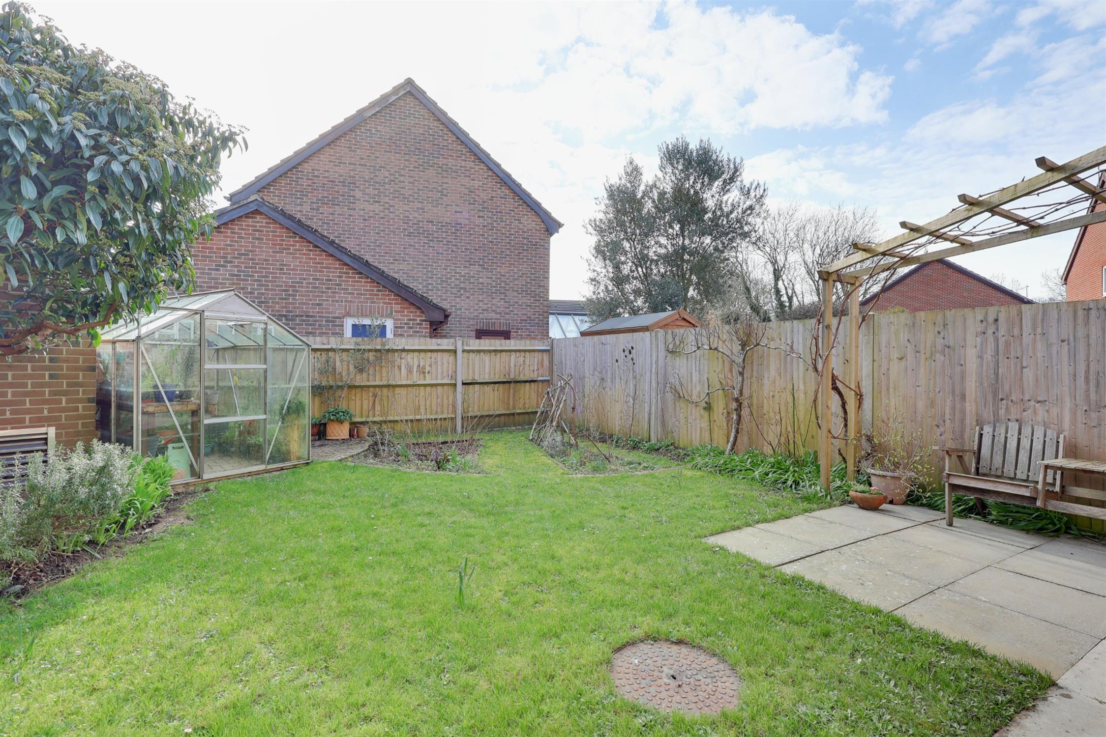 South facing and fence enclosed. Mainly laid to lawn with a paved hardstanding, greenhouse, planted borders, paved patio area, timber-built shed and side access.