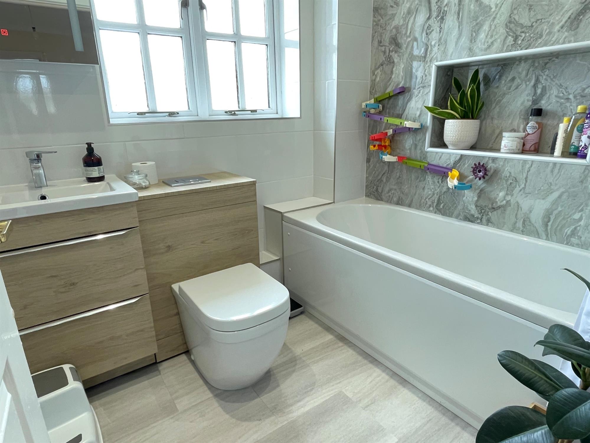 Window to front. Low level WC with concealed flush. Inset wash hand basin with drawers below. Panelled bath with shower over. Complementary tiling. Heated towel radiator.