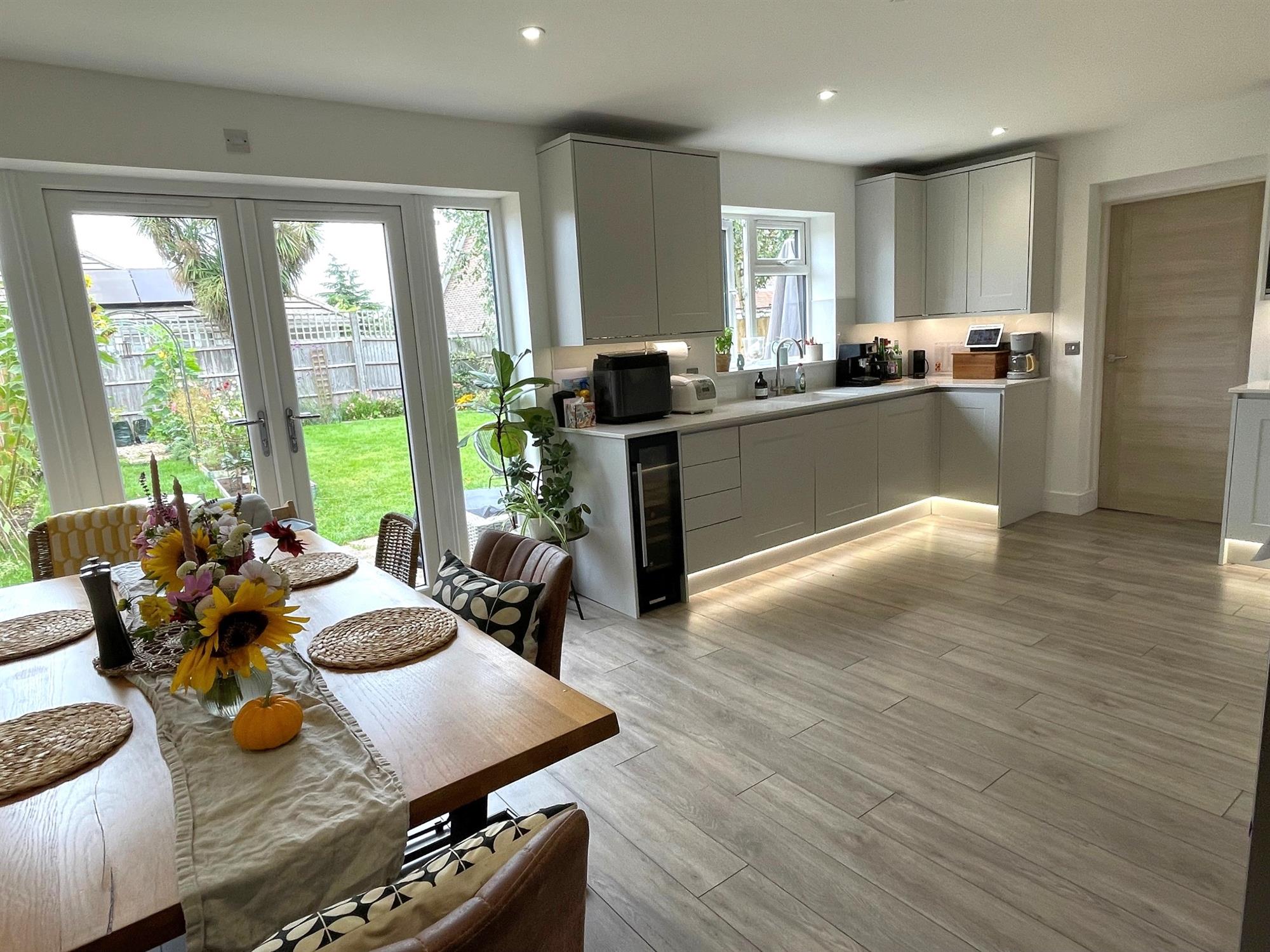 Window to rear. Comprehensive range of modern wall and base units with quartz work surfaces over. Inset sink with mixer tap. Induction hob with extractor over. Built in eye level microwave oven. Integrated dishwasher. Space for American fridge freezer. Wine cooler. Double opening doors with glazed side screens to garden. Door into: