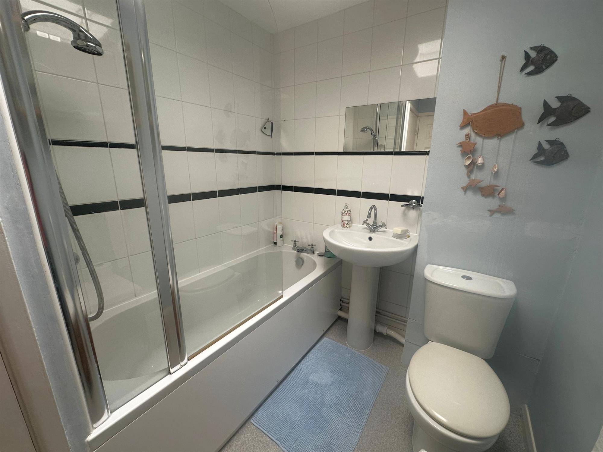 Comprising white suite of panelled bath with shower over and glazed screen. Pedestal wash hand basin. Close coupled WC. Complementary tiling. Radiator.