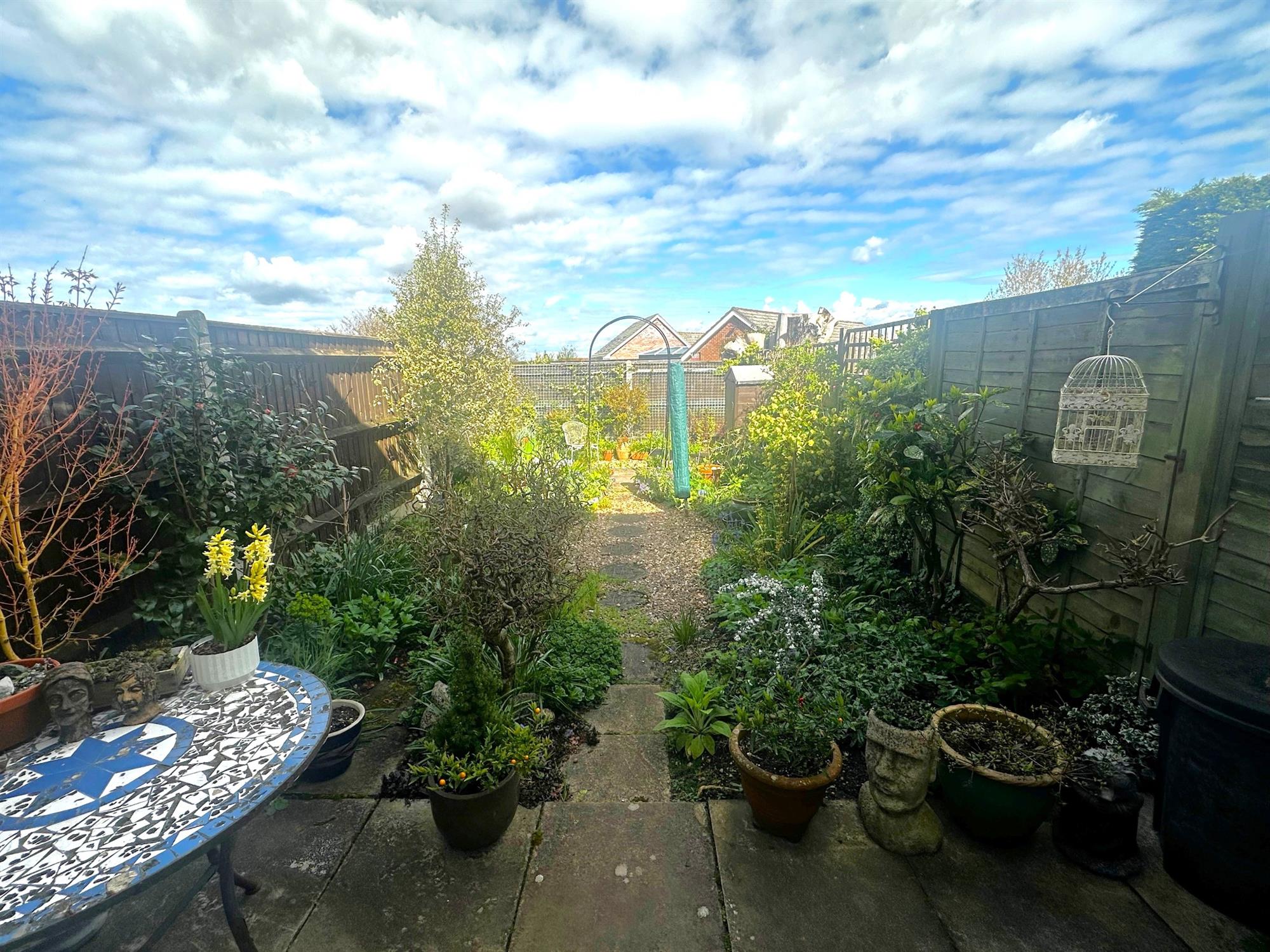 Fenced to boundaries. Laid to shingle with numerous established shrubs, trees and bushes. Garden shed. Patio area.