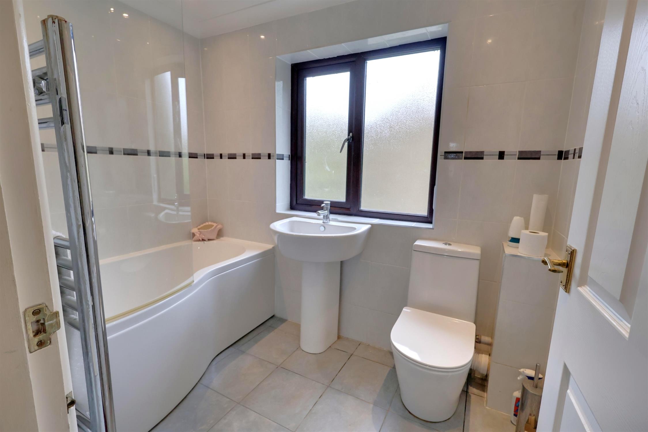 Fully tiled with luxury refitted suite comprising 'P' shape bath with independent shower over. Glazed shower screen. Wash basin. Low level W.C. Ladder style radiator. Obscure double glazed window to rear.