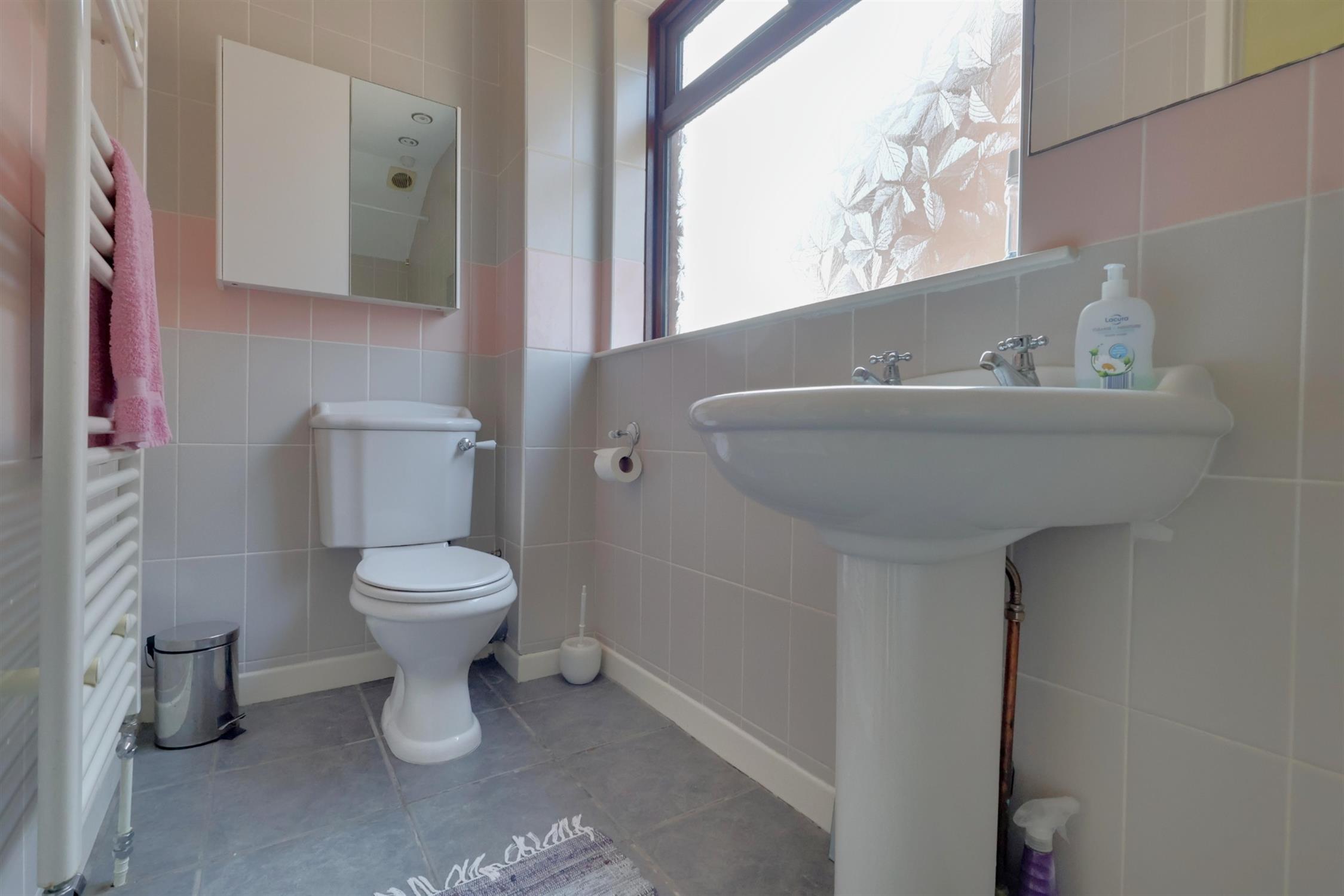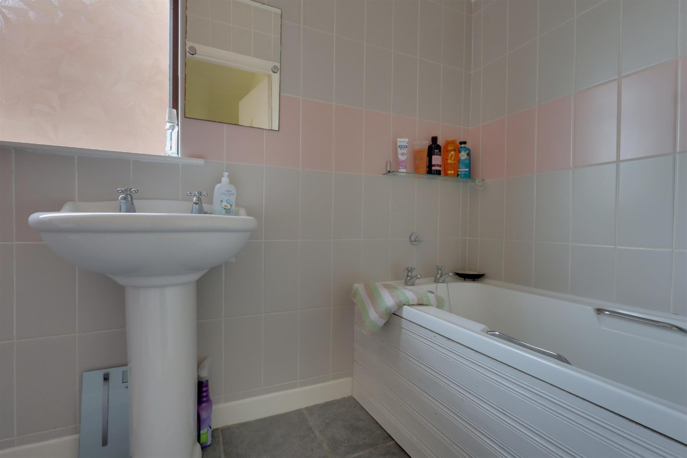 Panelled bath with shower attachment. WC. Ceramic sink. Heated towel rail. Loft access. Frosted double glazed window.