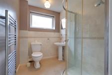 Frosted uPVC window to side aspect. Suite comprises close coupled WC, pedestal hand basin, large corner shower unit with wall mounted controls and removable shower head. Tiled walls. Ladder style heated towel rail.