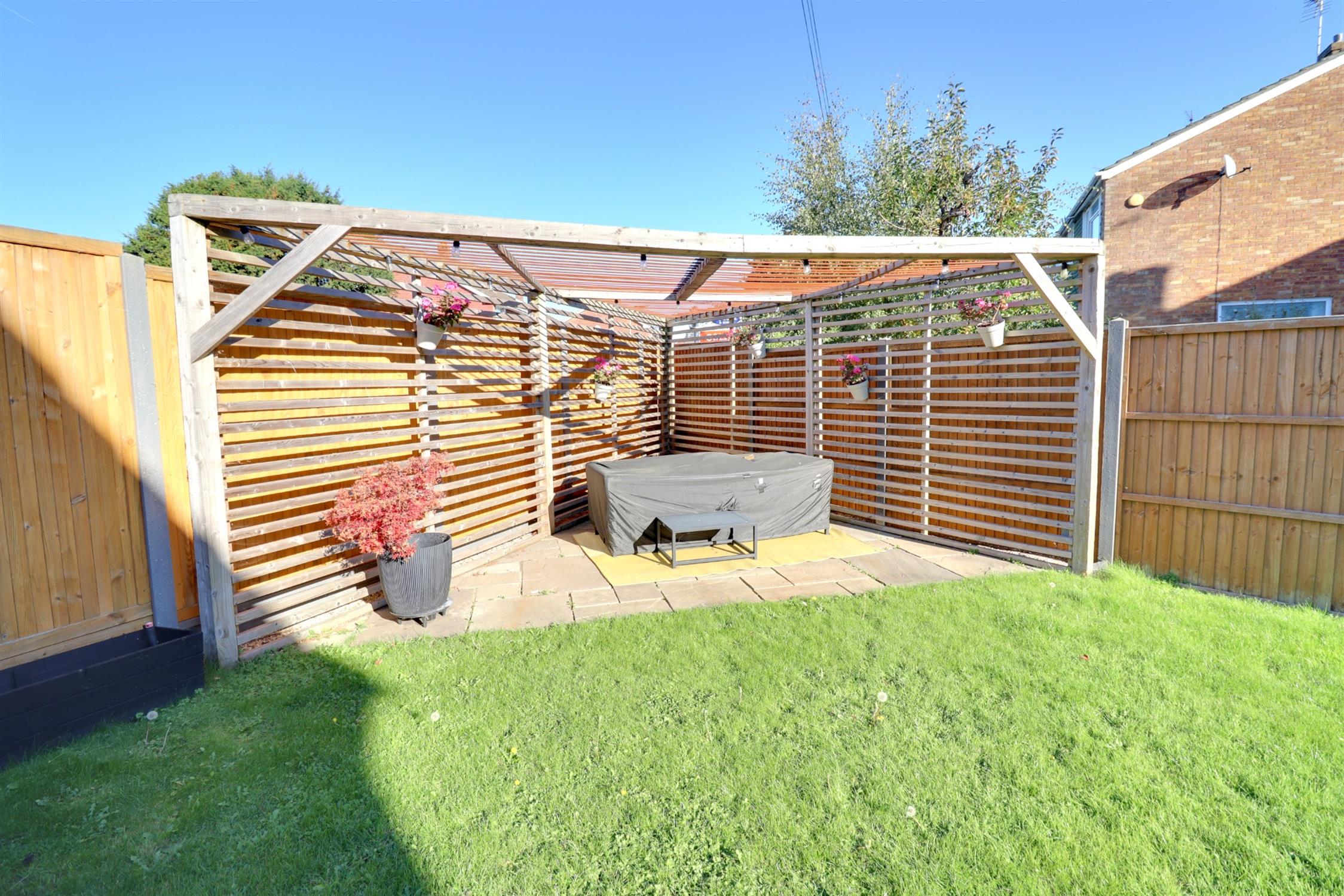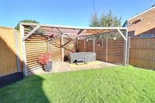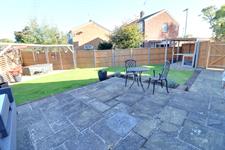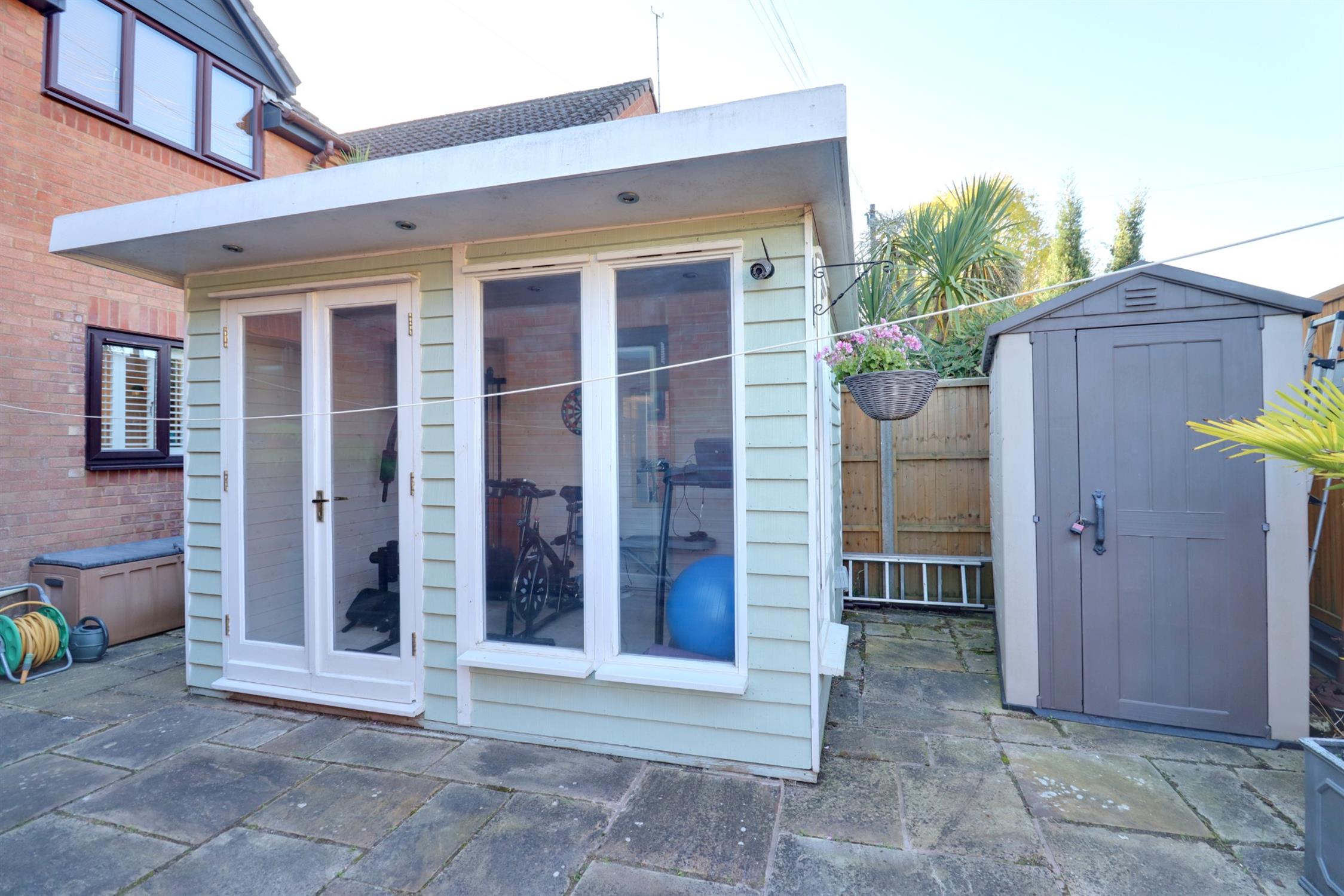 Laid to patio, enclosed by fence opening to the side garden, rear pedestrian access, wooden gym/home office with light and power and double glazed window and double glazed double doors.