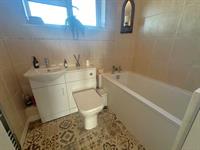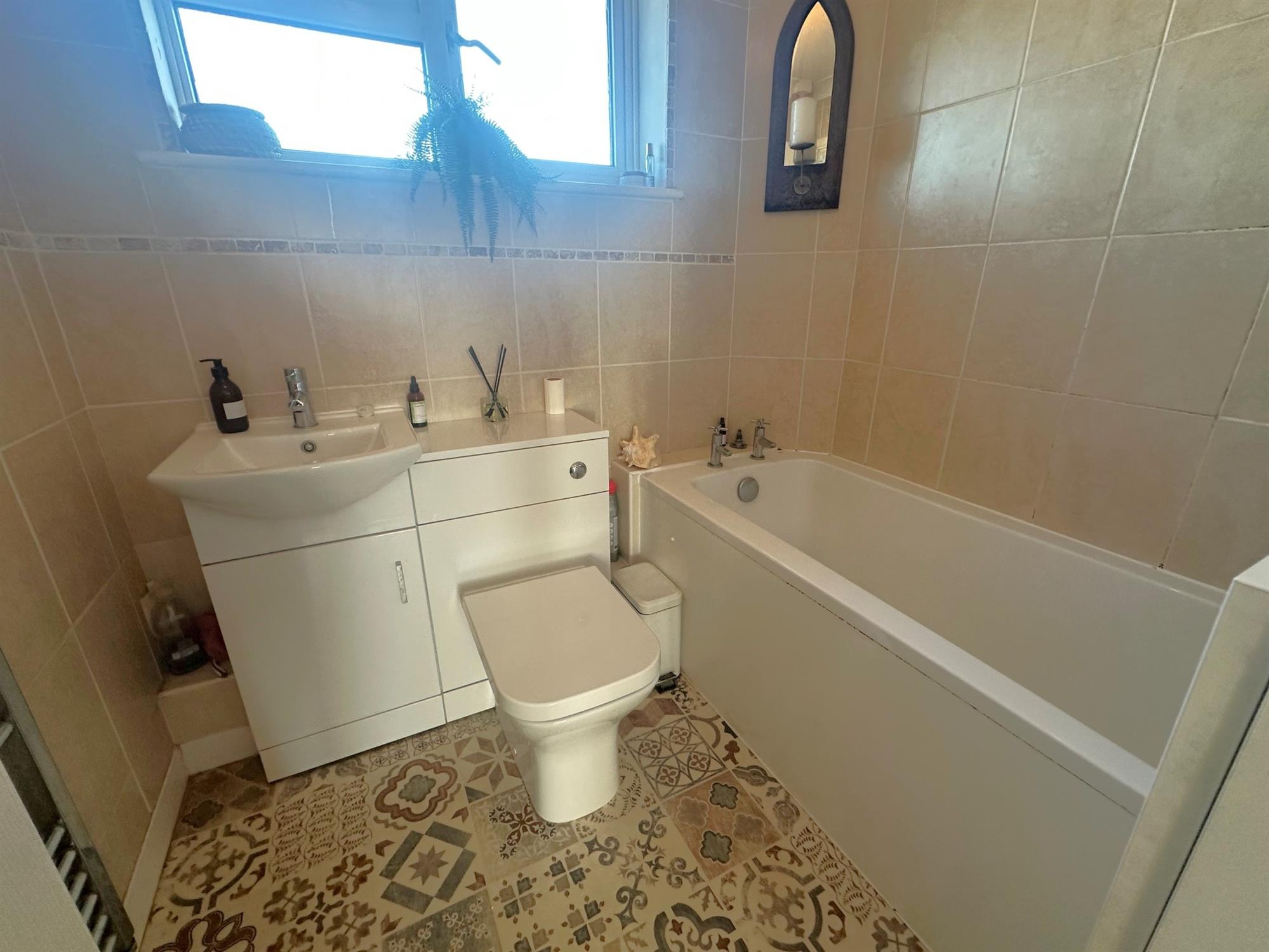 UPVC obscure glazed window to rear aspect. Comprising a white suite of panelled bath, wash hand basin with cupboard below. Concealed flush WC. Fully tiled with complementary tiling. Chrome heated towel radiator.