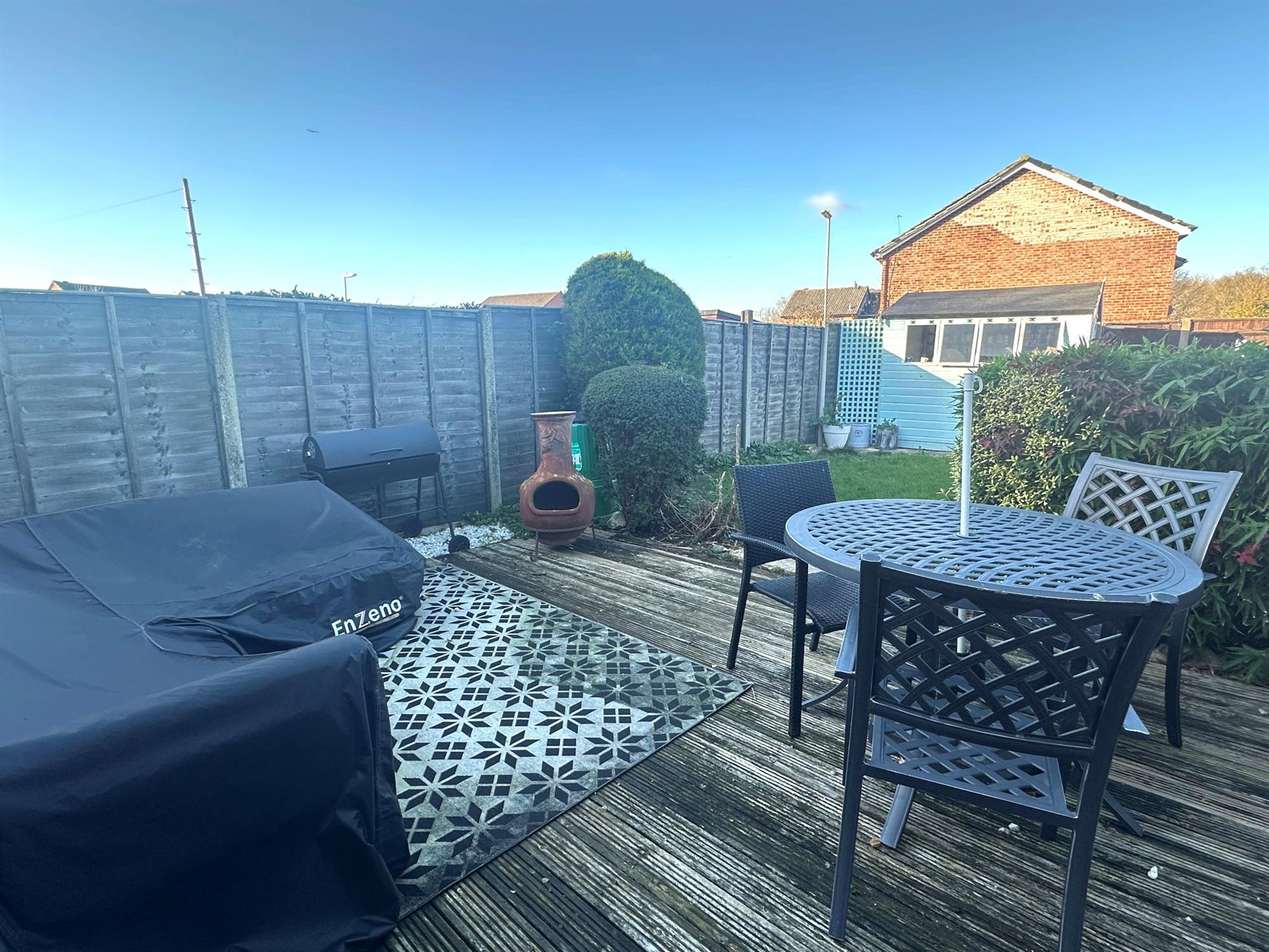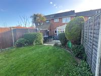 Fenced to boundaries. Laid to lawn. Patio area. Timber built garden shed. Shrubs, trees and bushes.