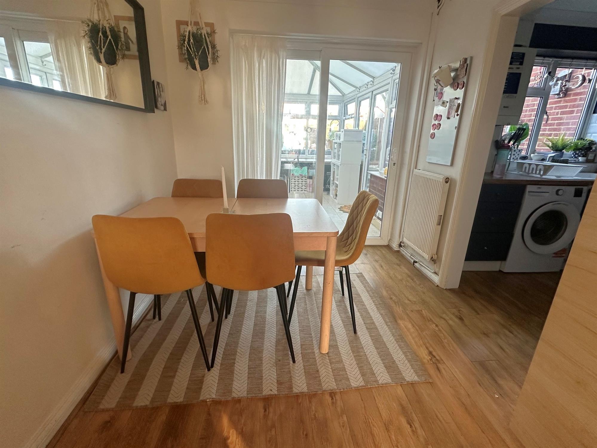 Wood effect flooring. Radiator. Opening to kitchen, double glazed sliding patio doors to: