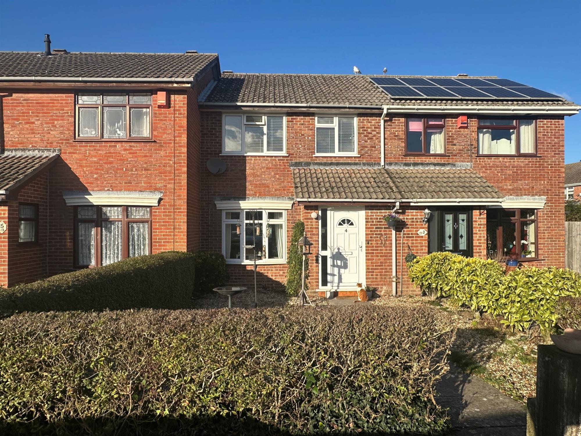 Hedging to front and side boundaries. Laid to shingle. Path to front entrance. Allocated parking space.