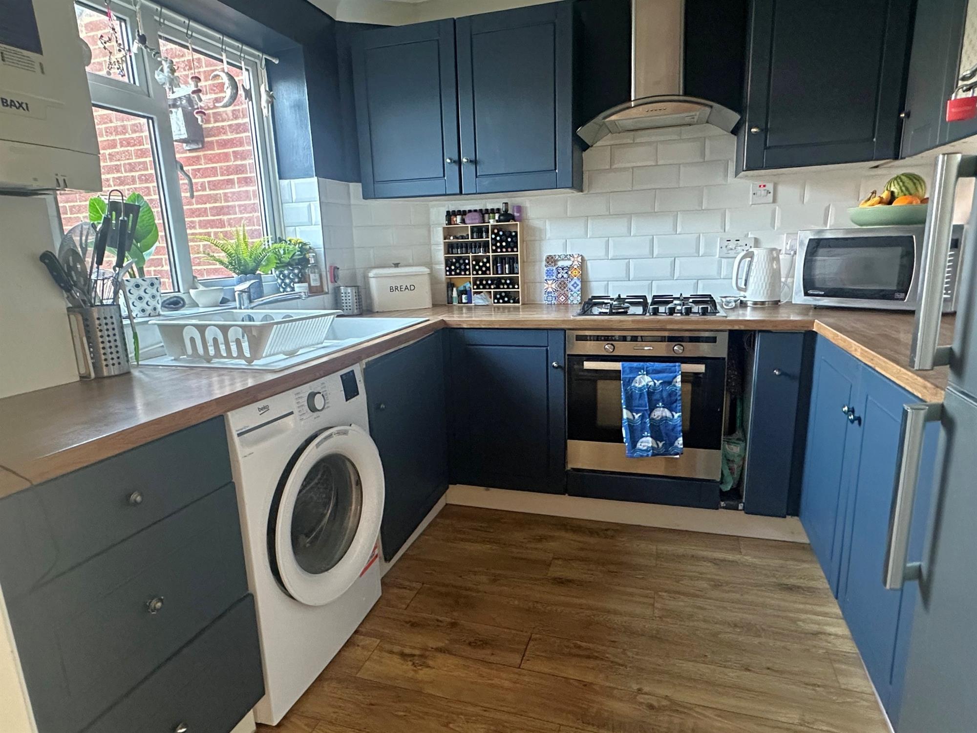 Window to rear aspect. Fitted with a comprehensive range of base and wall units with working surfaces over. Complementary tiling to splashbacks. Space and plumbing for washing machine. Inset enamel single drainer sink unit with mixer tap. Built-in electric oven within Inset gas hob and extractor hood fitted over. Space for fridge/freezer. Wooden flooring.