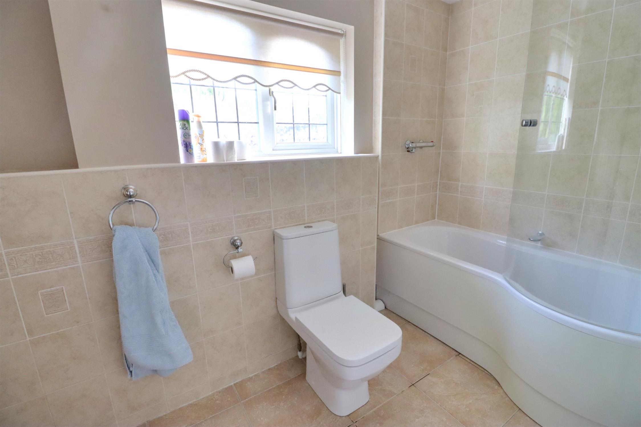 Panel enclosed bath, large corner shower cubicle with sliding glass doors, low level WC, vanity unit, heated towel rail, side aspect double glazed obscured window, tiled walls.