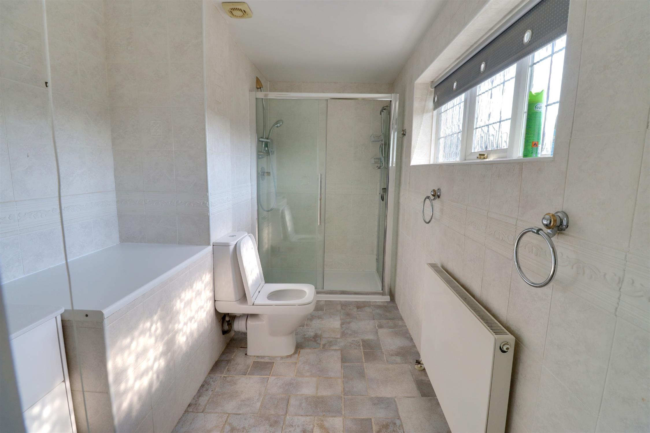 Large shower enclosure with glass screen, low level WC and vanity unit, tiled walls, radiator, front aspect double glazed lead light obscured window.