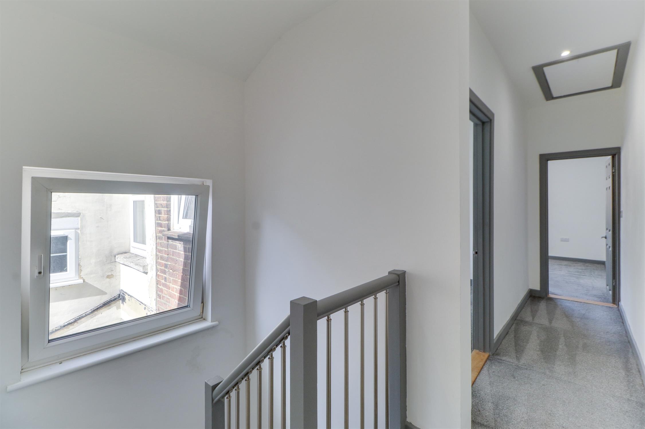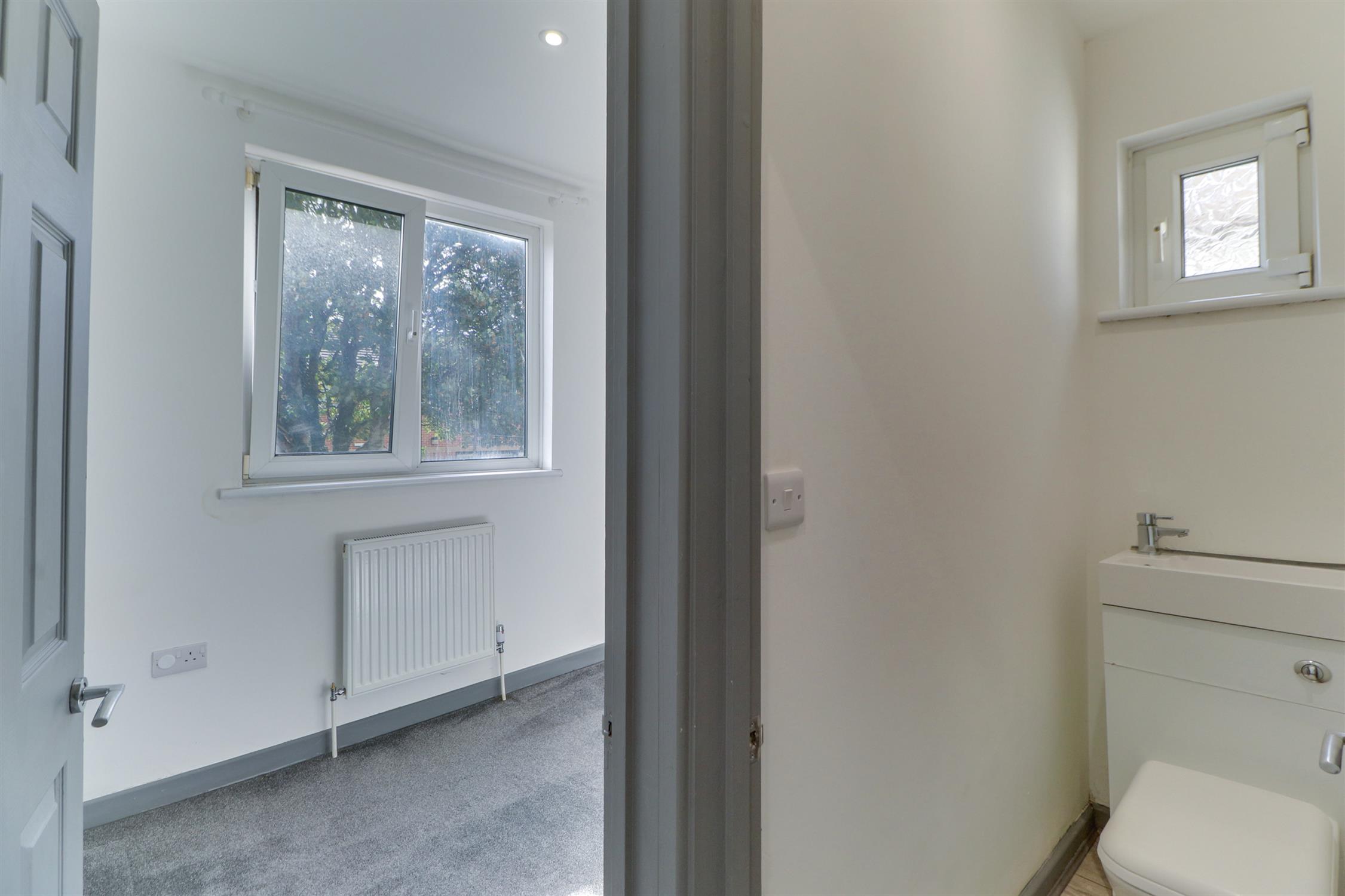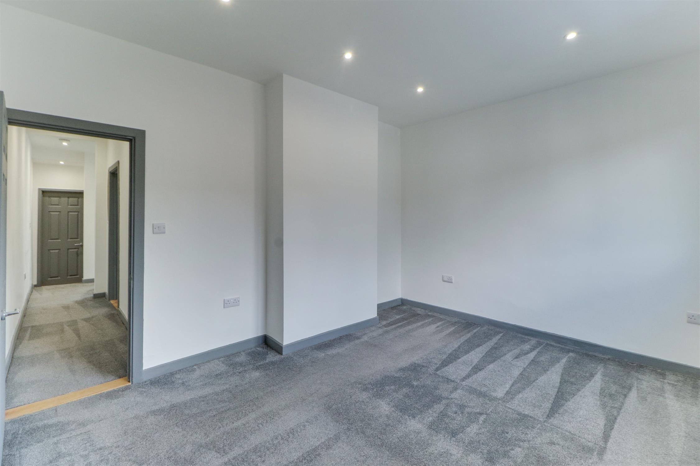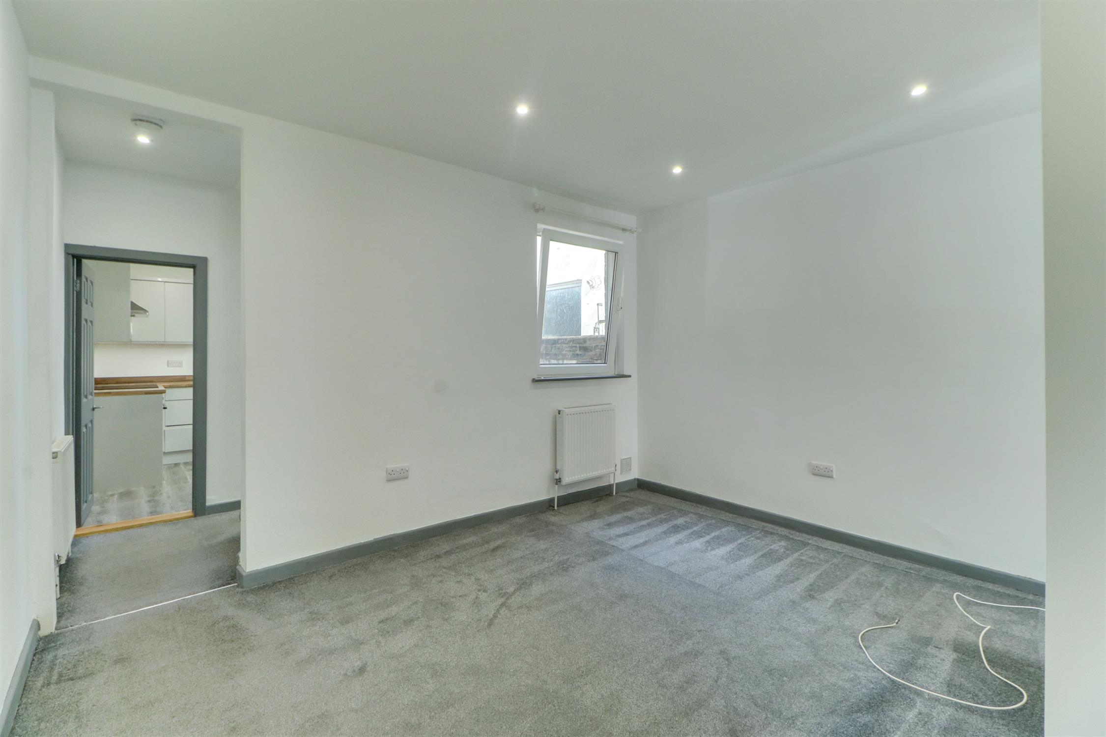 Smooth ceiling, inset spotlights, UPVC double-glazed window, radiator, fitted carpet and door into:
