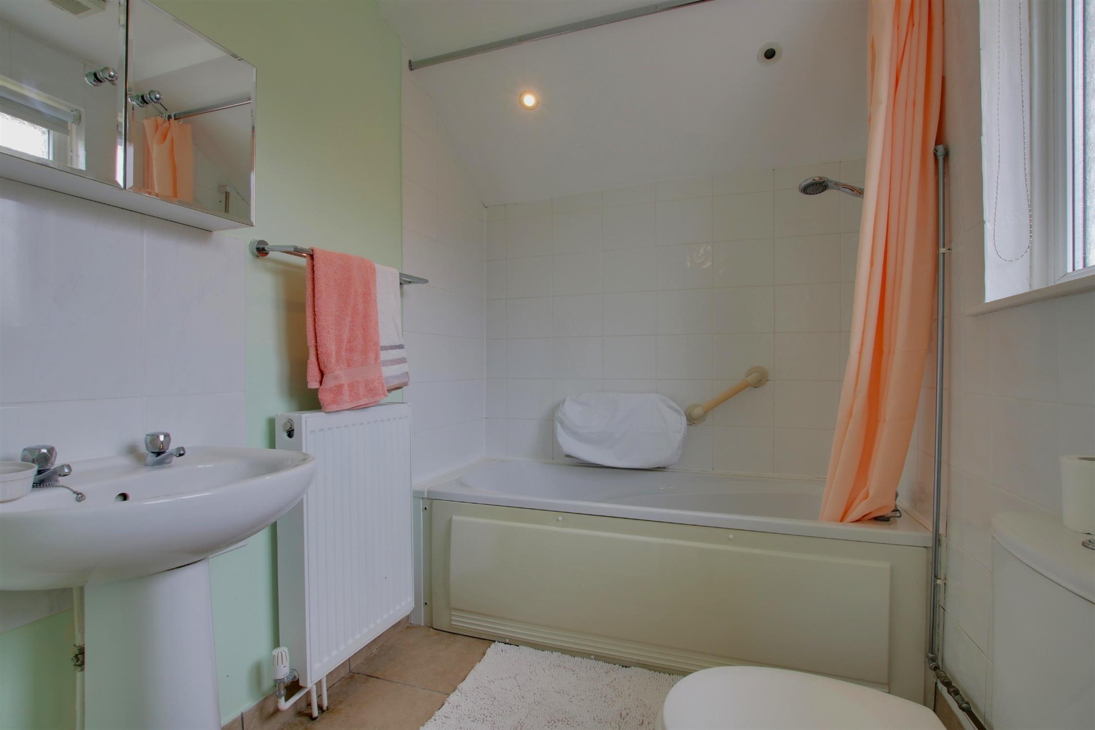 Modern white suite comprising panel enclosed bath with shower over, shower rail and curtain, pedestal wash basin, low level WC, tiled floor and part tiled walls, extractor fan, radiator, double-glazed window to the side.