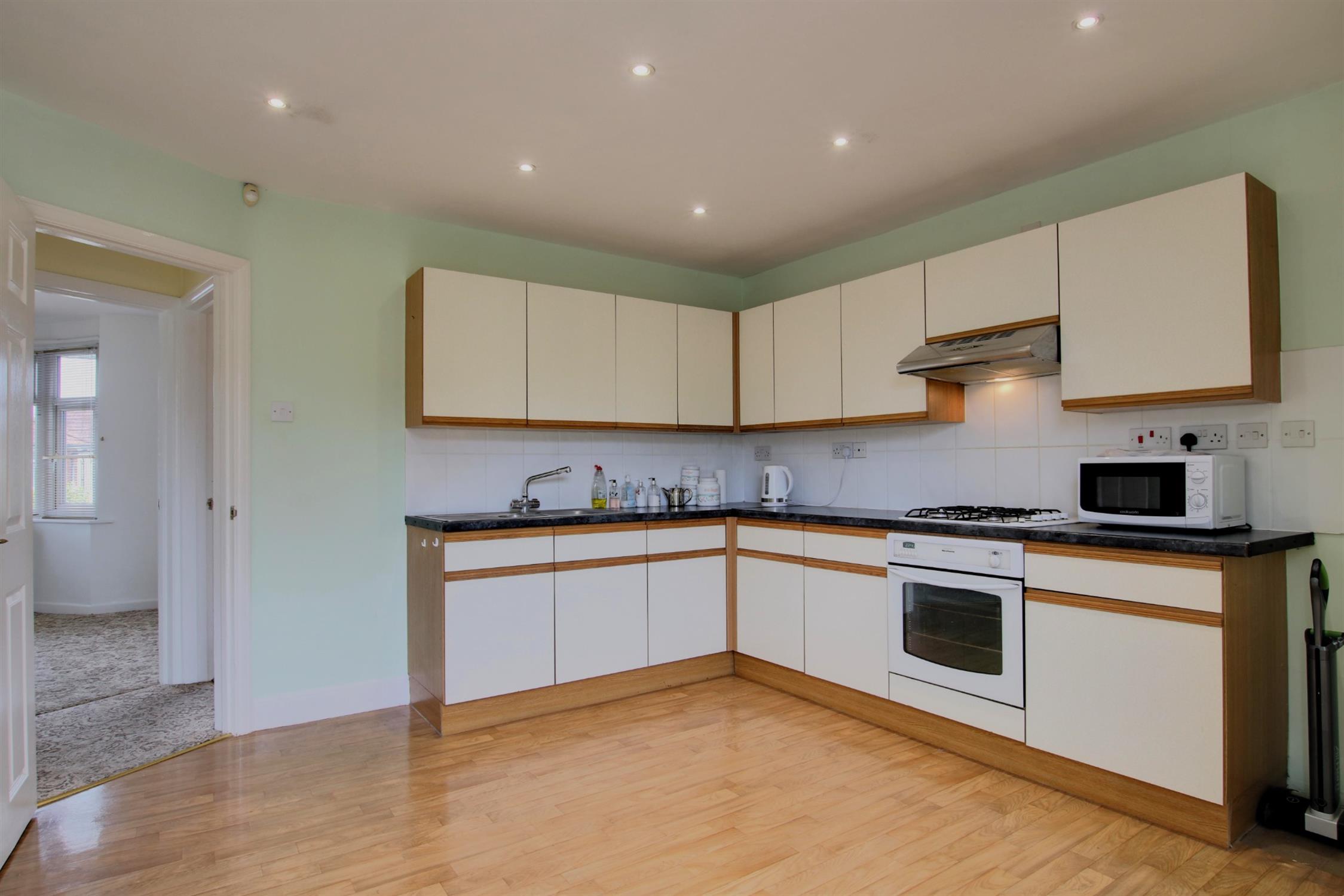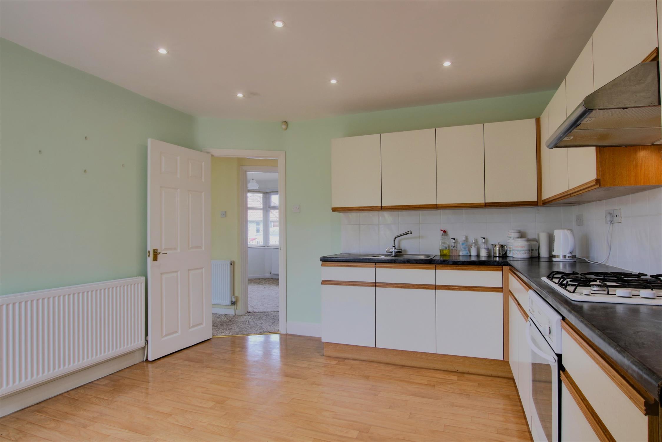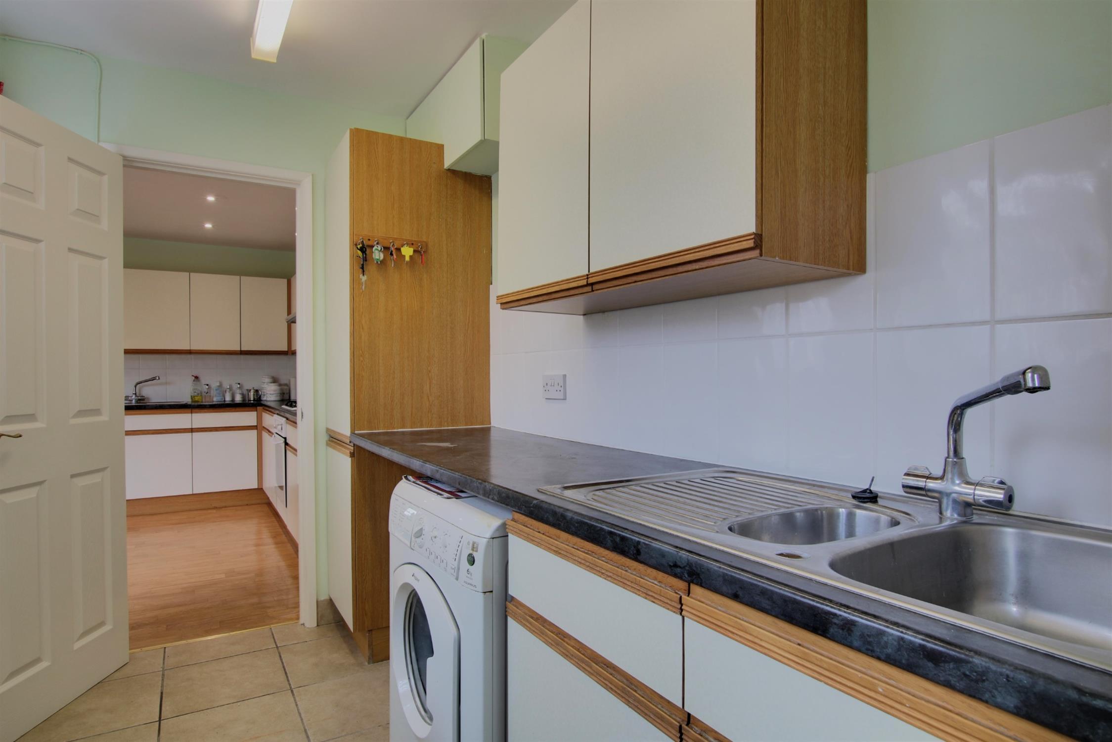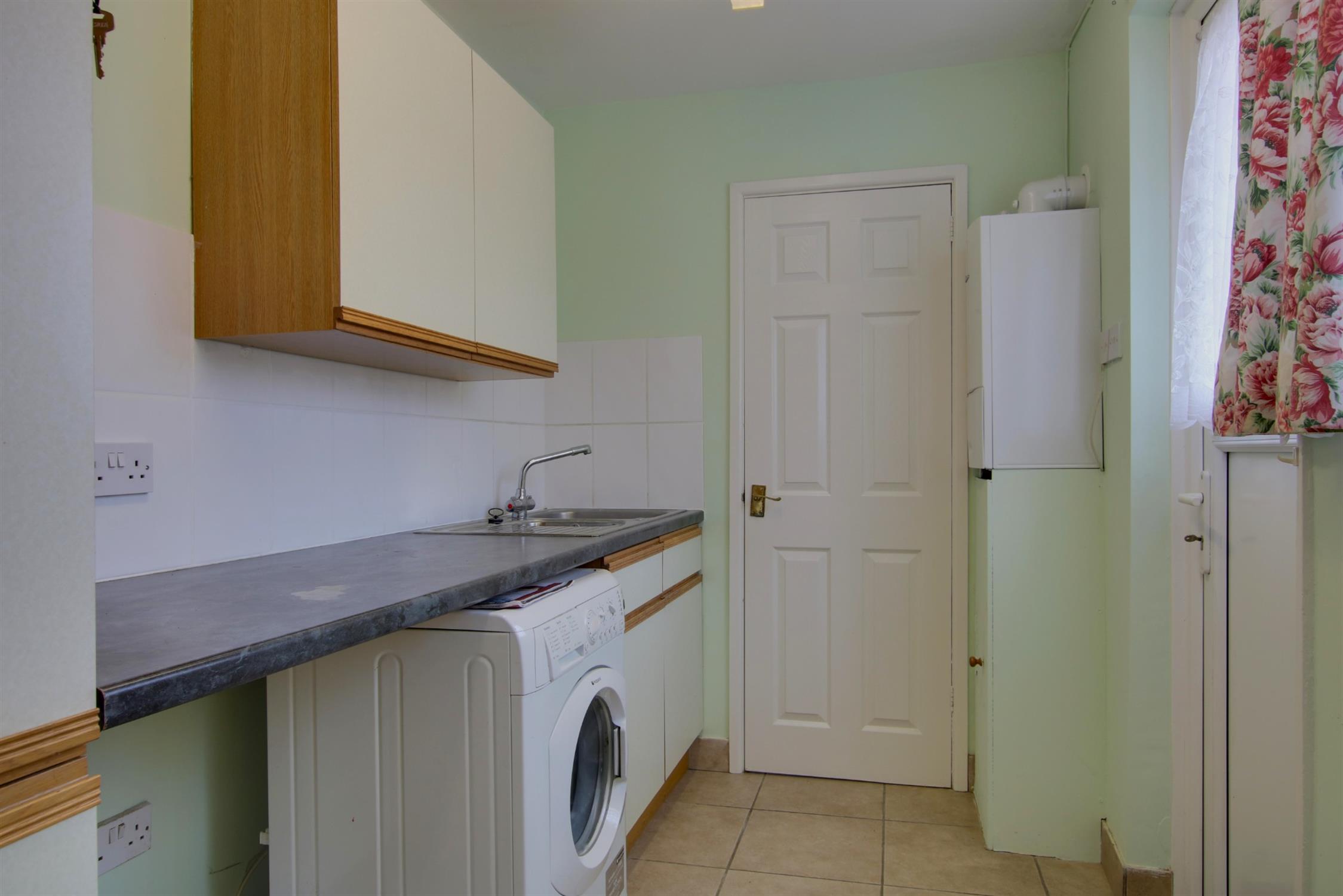 Fitted cupboard and matching wall and base units with roll-edge work surface over and tiled surrounds, inset one-and-a-half bowl single drainer stainless steel sink with mixer tap, plumbing for washing machine, wall-mounted Worcester combination central heating boiler. Door to: