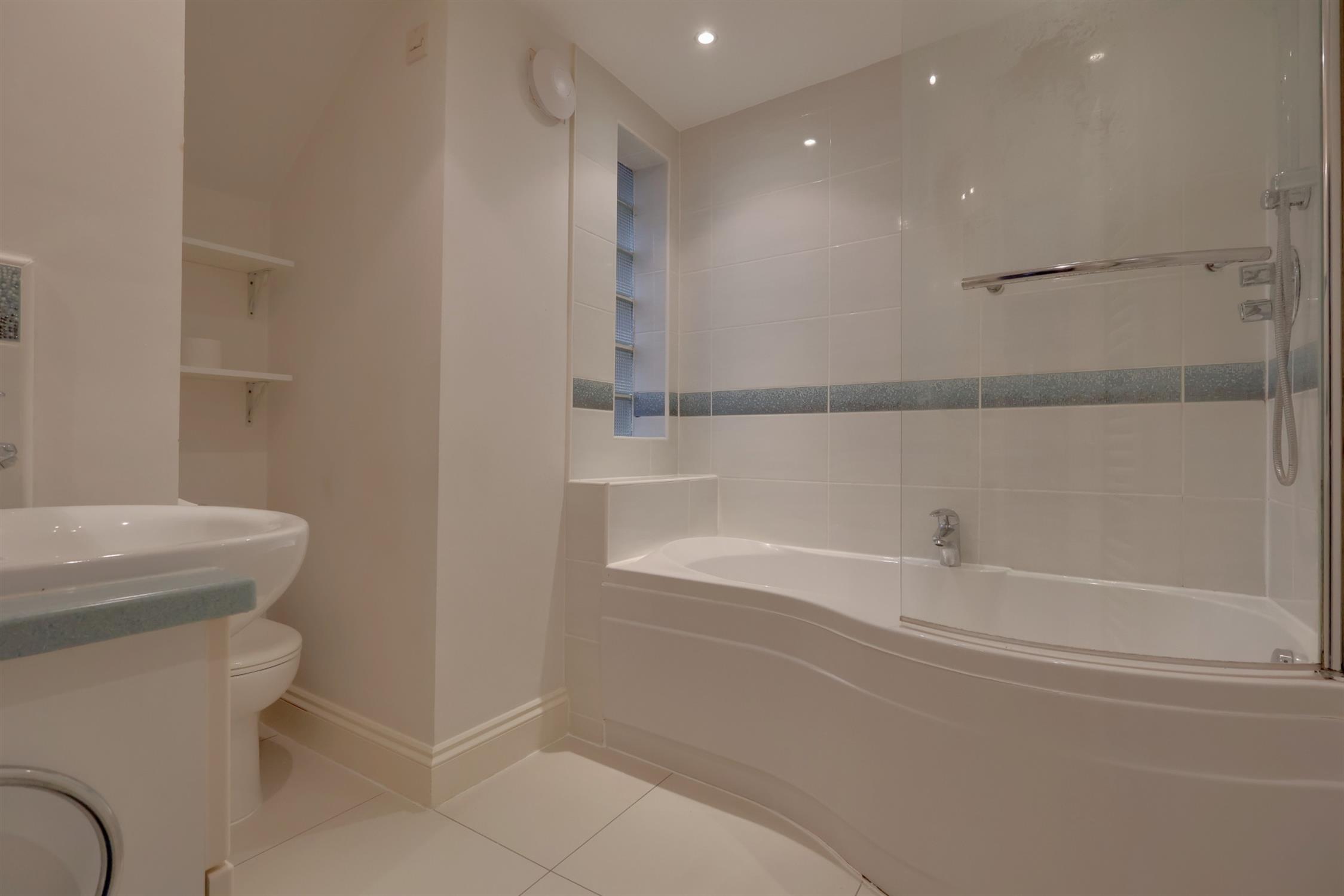 Obscure glazed window to side elevation. Bathroom consists of a three piece suite. P-shaped bath with shower over. Low level W.C. Vanity wash hand basin. Ladder radiator. Part tiled walls. Tiled floor