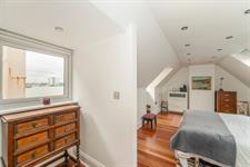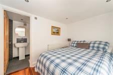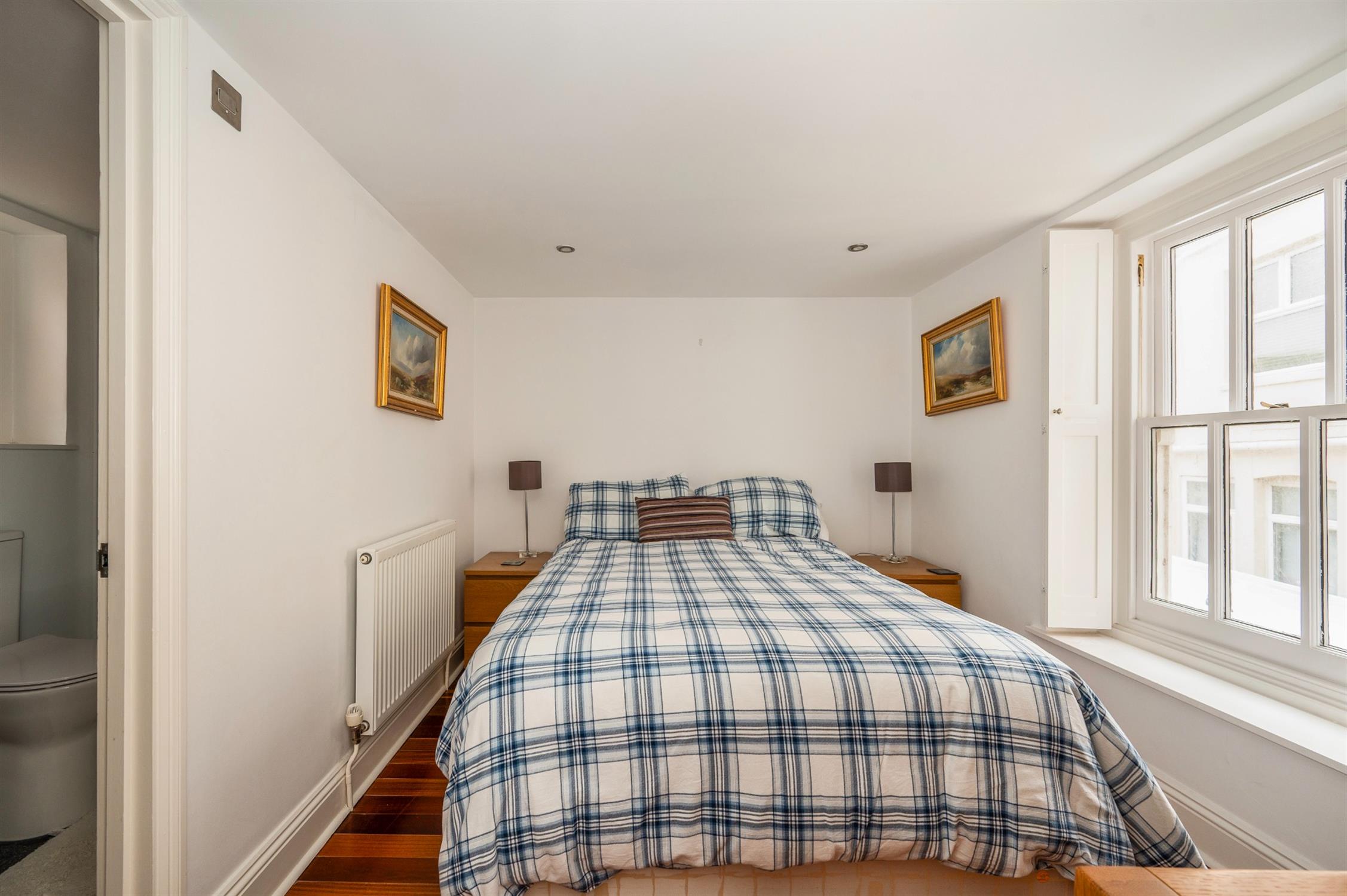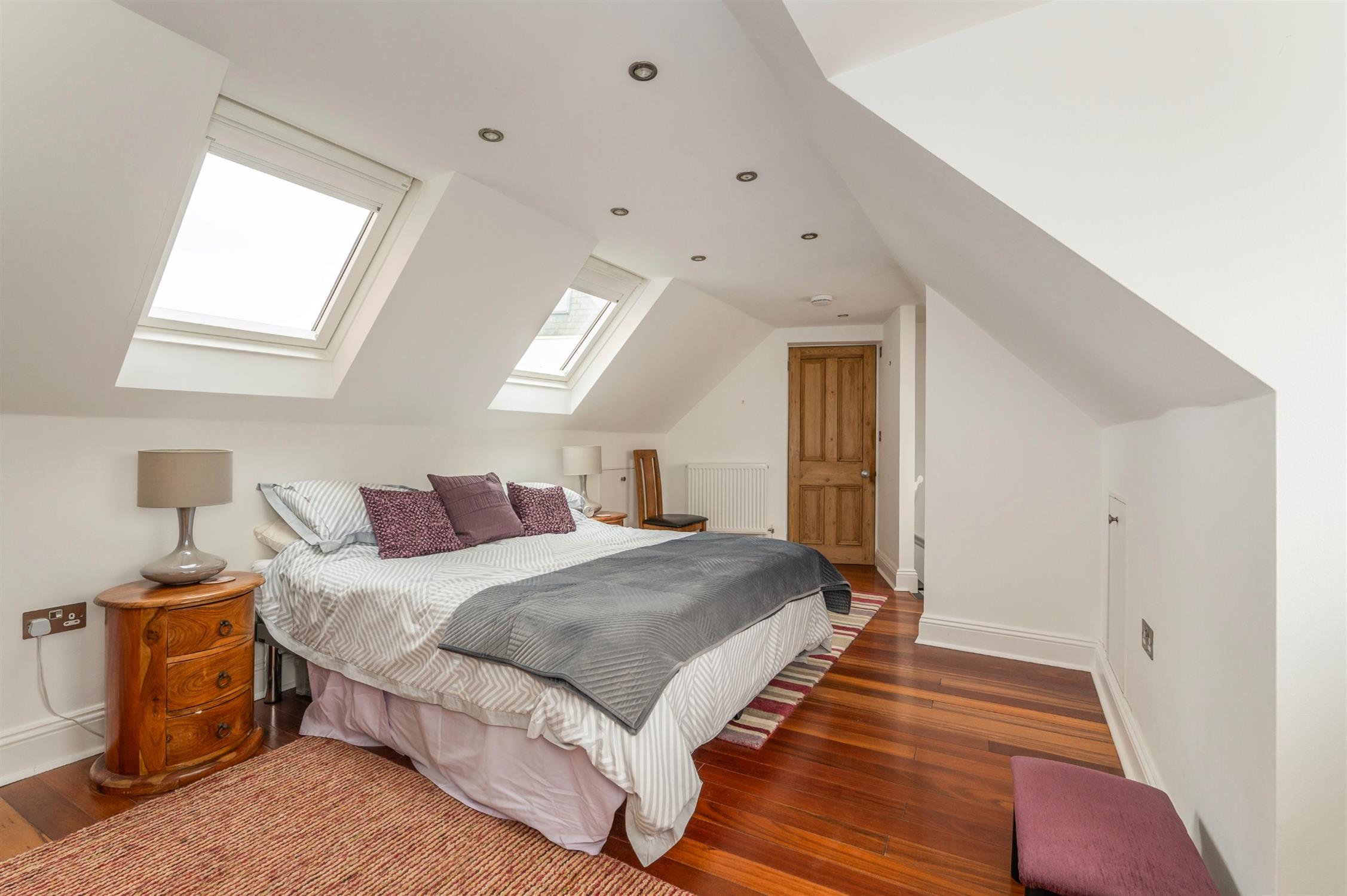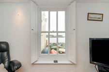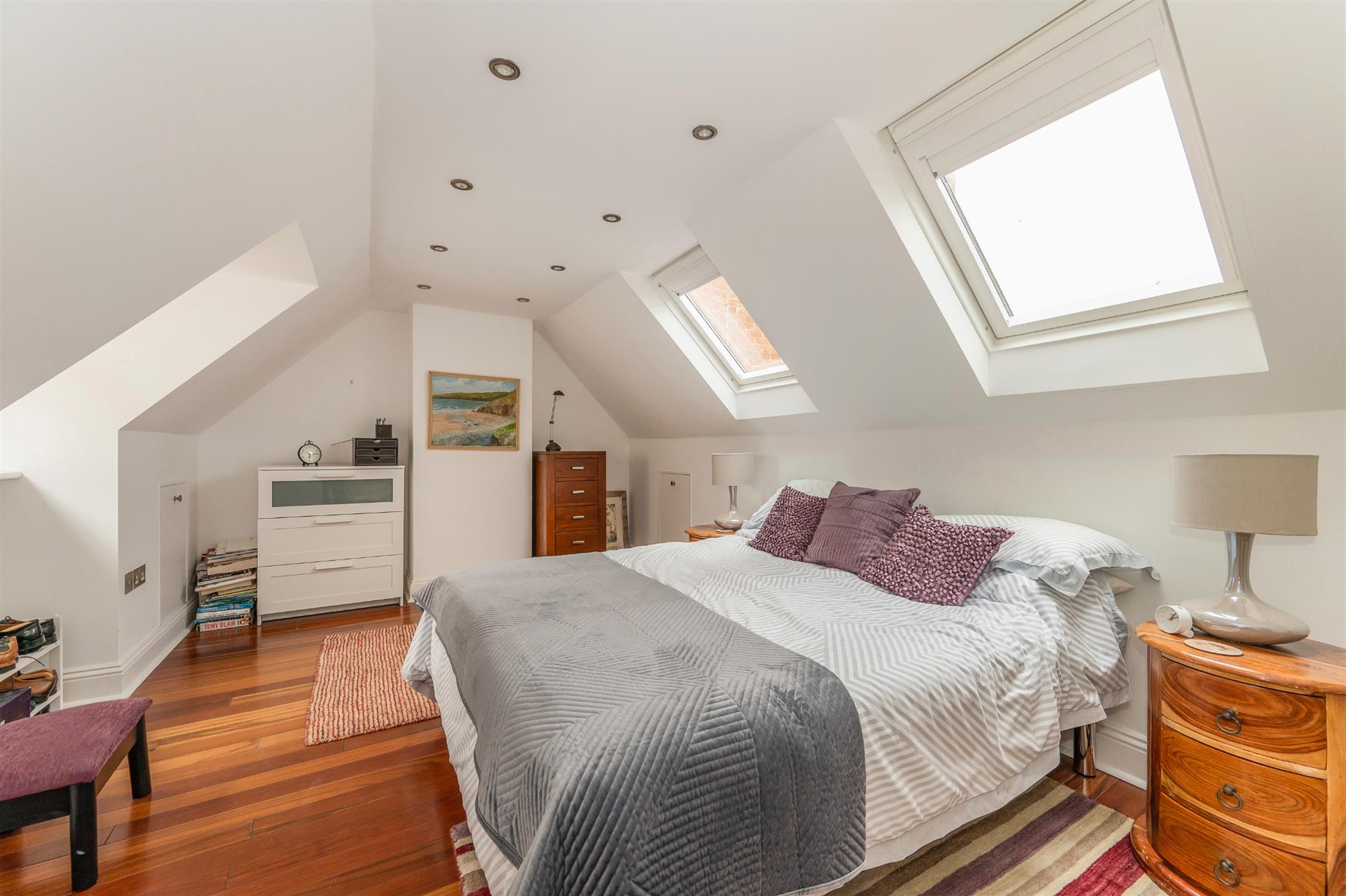 Inset spotlights, two double glazed sash windows with harbour views, two Velux windows with built-in blinds, radiator, various eaves storage cupboards, wood flooring.