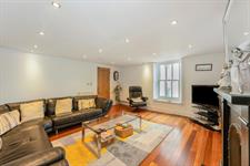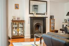 Inset spotlights, two double glazed sash window with wooden shutters and harbour views, fireplace, two radiators, wood flooring.
