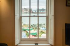 Inset spotlights, double glazed sash window with wooden shutters and harbour views, stairs to second floor.
