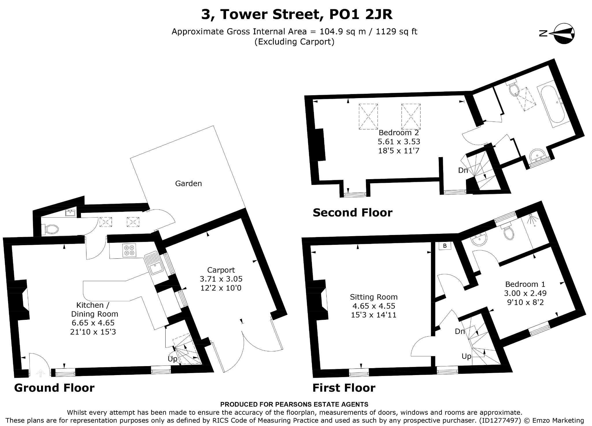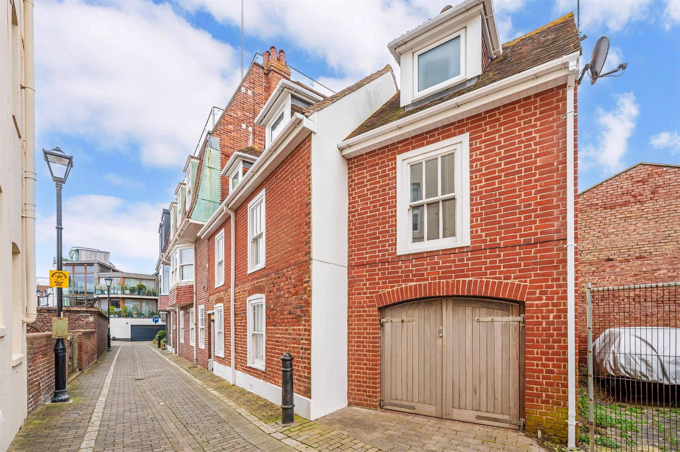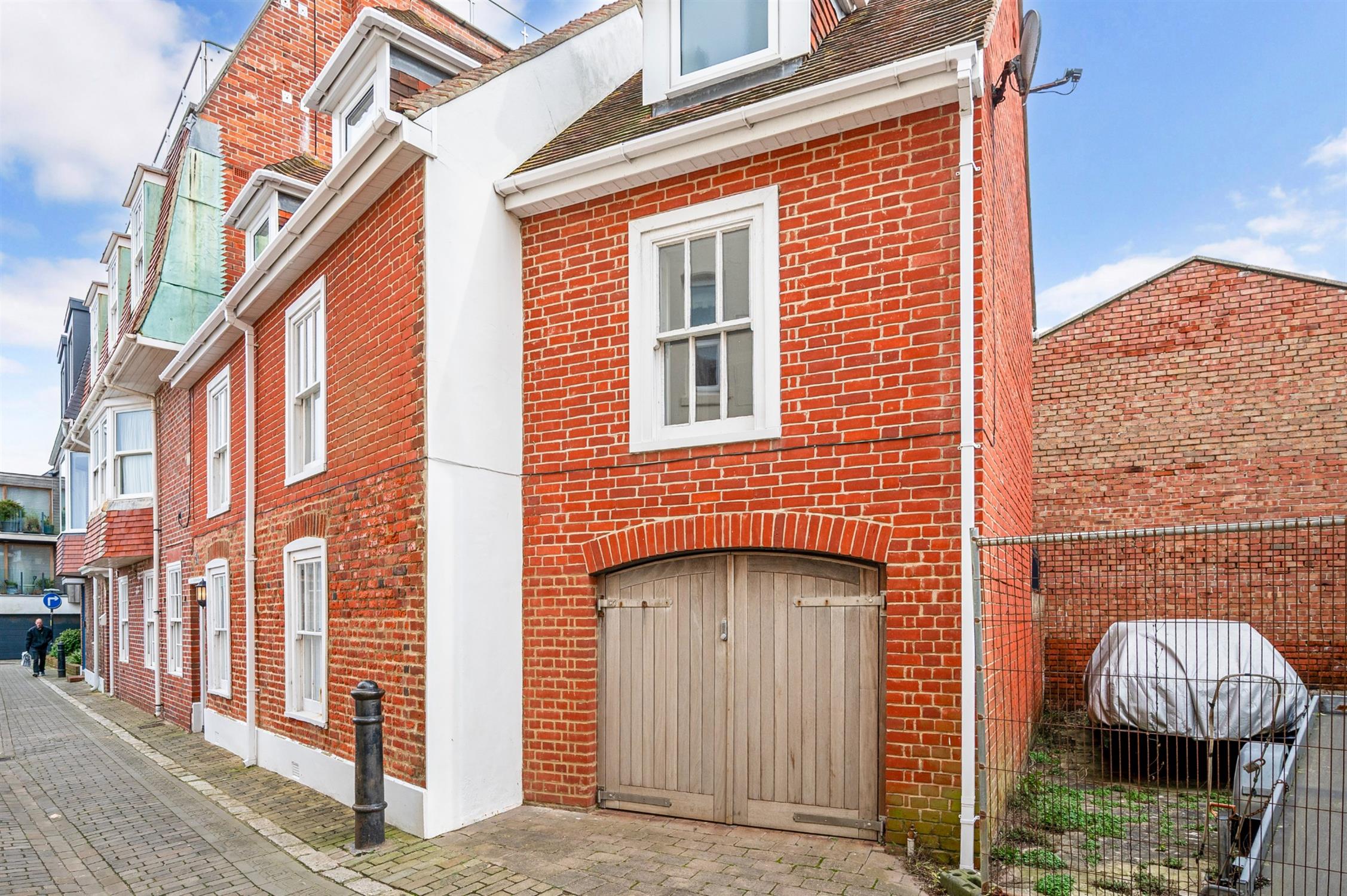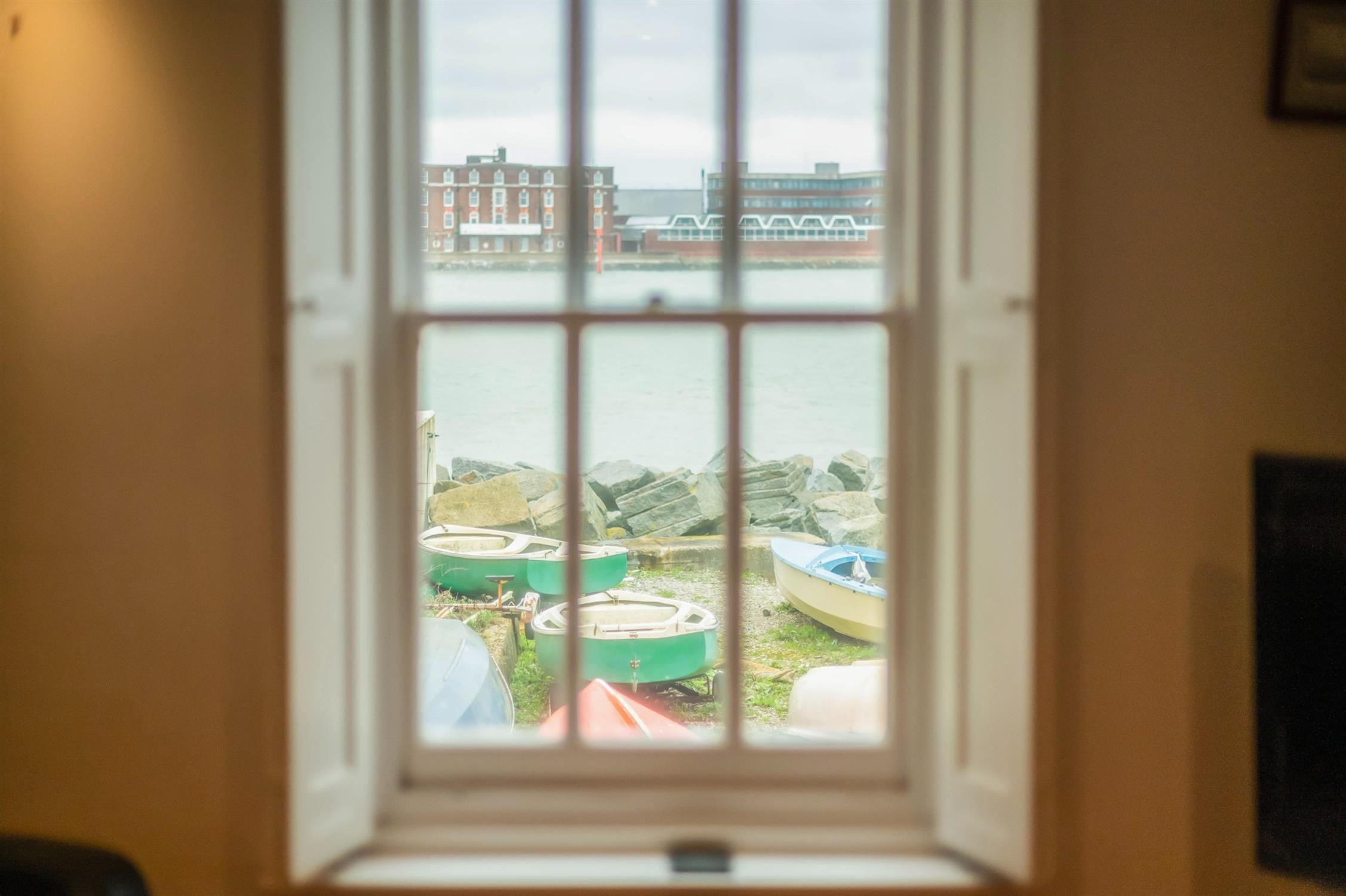 Today, the cottage forms part of the historic streetscape of Tower Street, moments from the Camber and harbour entrance. Arranged over three storeys, the accommodation is both characterful and immaculately presented throughout, with exposed beams and historic detailing sitting comfortably alongside tasteful contemporary finishes. The ground floor features a superb kitchen/dining room with exposed ceiling beams and supporting post, and delightful views between Tower House and Boom Tower towards the mouth of Portsmouth Harbour - a constantly changing maritime backdrop. A convenient ground floor WC completes this level. On the first floor, the comfortable lounge enjoys the same captivating harbour views, making it a wonderful place to relax and watch the passing boats. Also on this floor is a well-proportioned bedroom suite with its own en-suite shower room and walk-in wardrobe. The second floor hosts a further impressive bedroom with vaulted ceilings, enhancing the sense of space and character, together with an en-suite bathroom. Externally, wooden gates open into a covered car port area beneath the first floor bedroom - ideal for secure parking or even storage for a small boat. There is also an attractive courtyard garden providing private outside space. Offered to the market in immaculate condition and with no forward chain, Black Horse Cottage represents a unique chance to own a piece of Old Portsmouth’s maritime history.