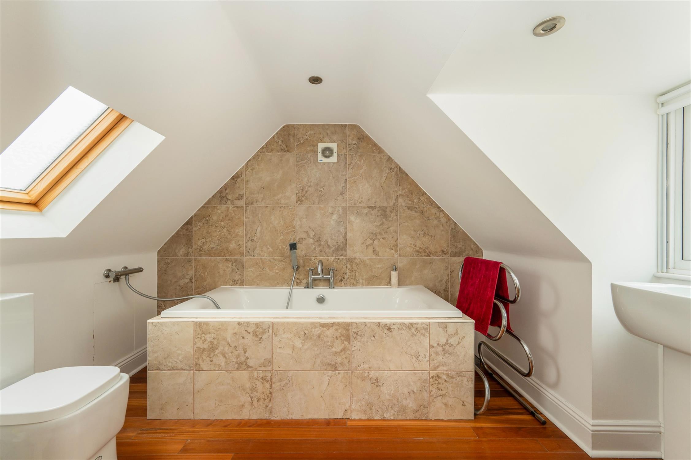 Inset spotlights, double glazed obscured window, Velux window, panelled bath with side taps and separate handheld shower, WC, pedestal wash hand basin, two wardrobes, wood flooring.