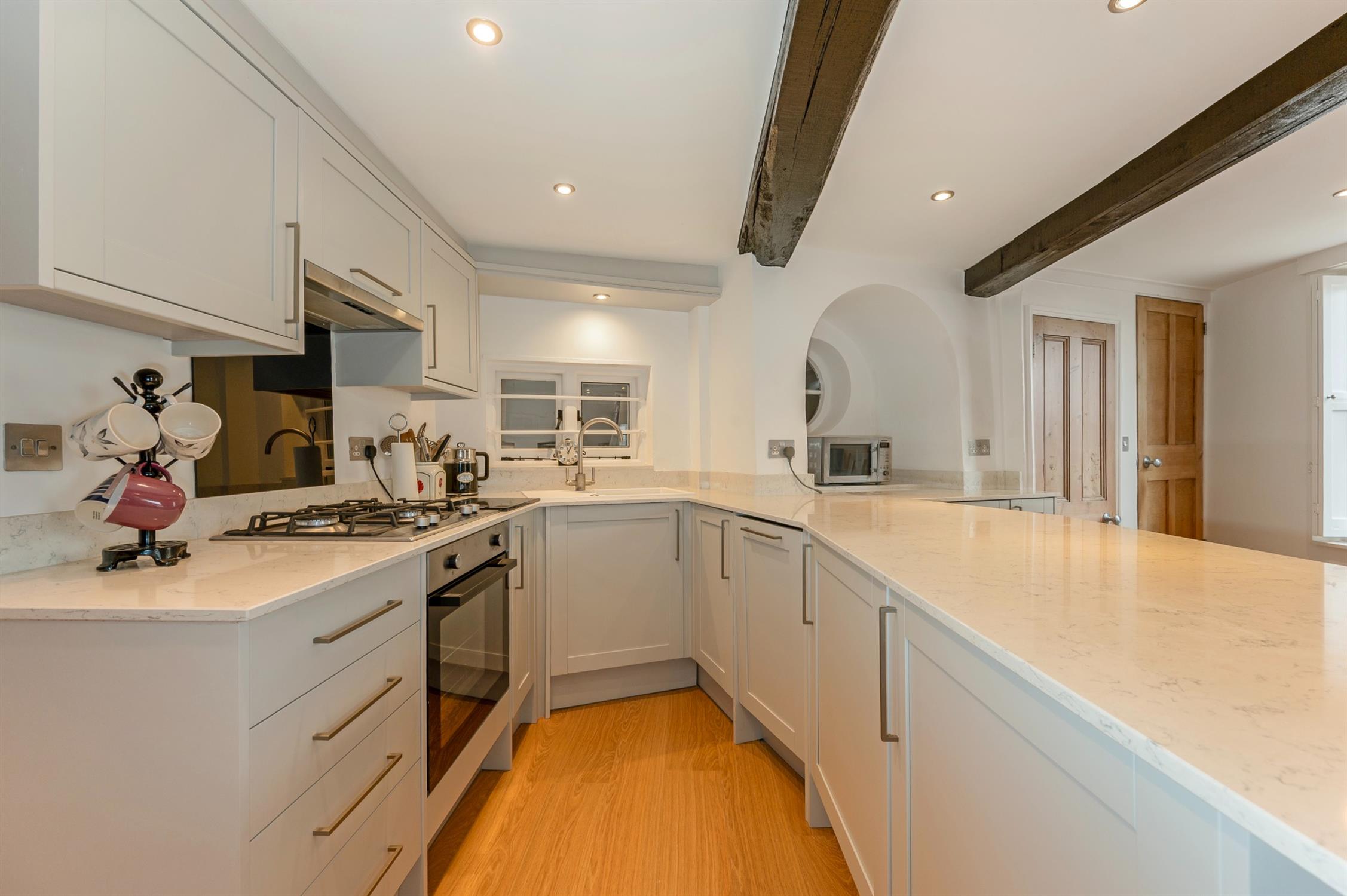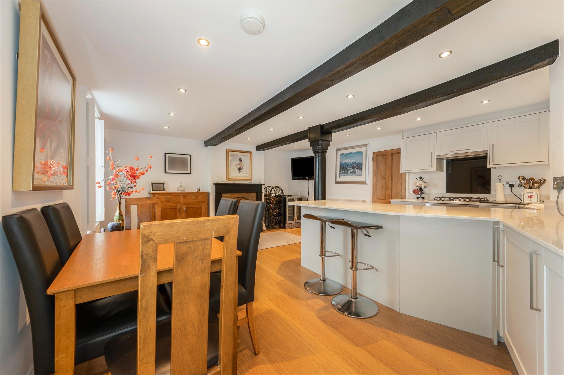 Inset spotlights, exposed beams and post, gas fire with surround, radiator, two sash windows with wooden shutters, under stairs storage cupboard, window and porthole window through to the carport, fitted kitchen comprising wall and base mounted units with quartz work surfaces over including breakfast bar, integrated fridge, integrated slimline dishwasher, integrated electric oven and gas hob with extractor fan over, laminate flooring.