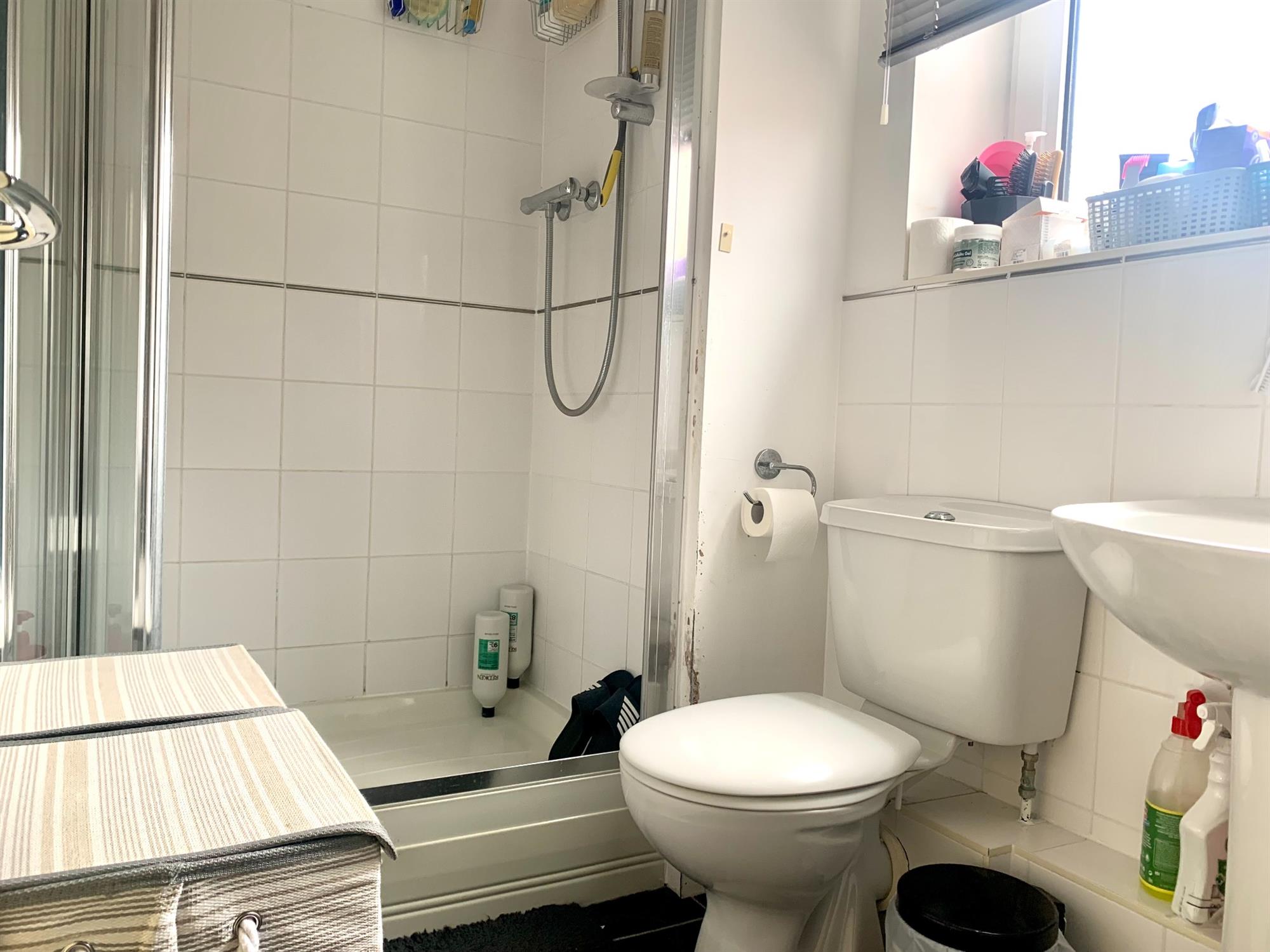 ENSUITE – White suite with shower cubicle, sink and toilet. Window to rear.