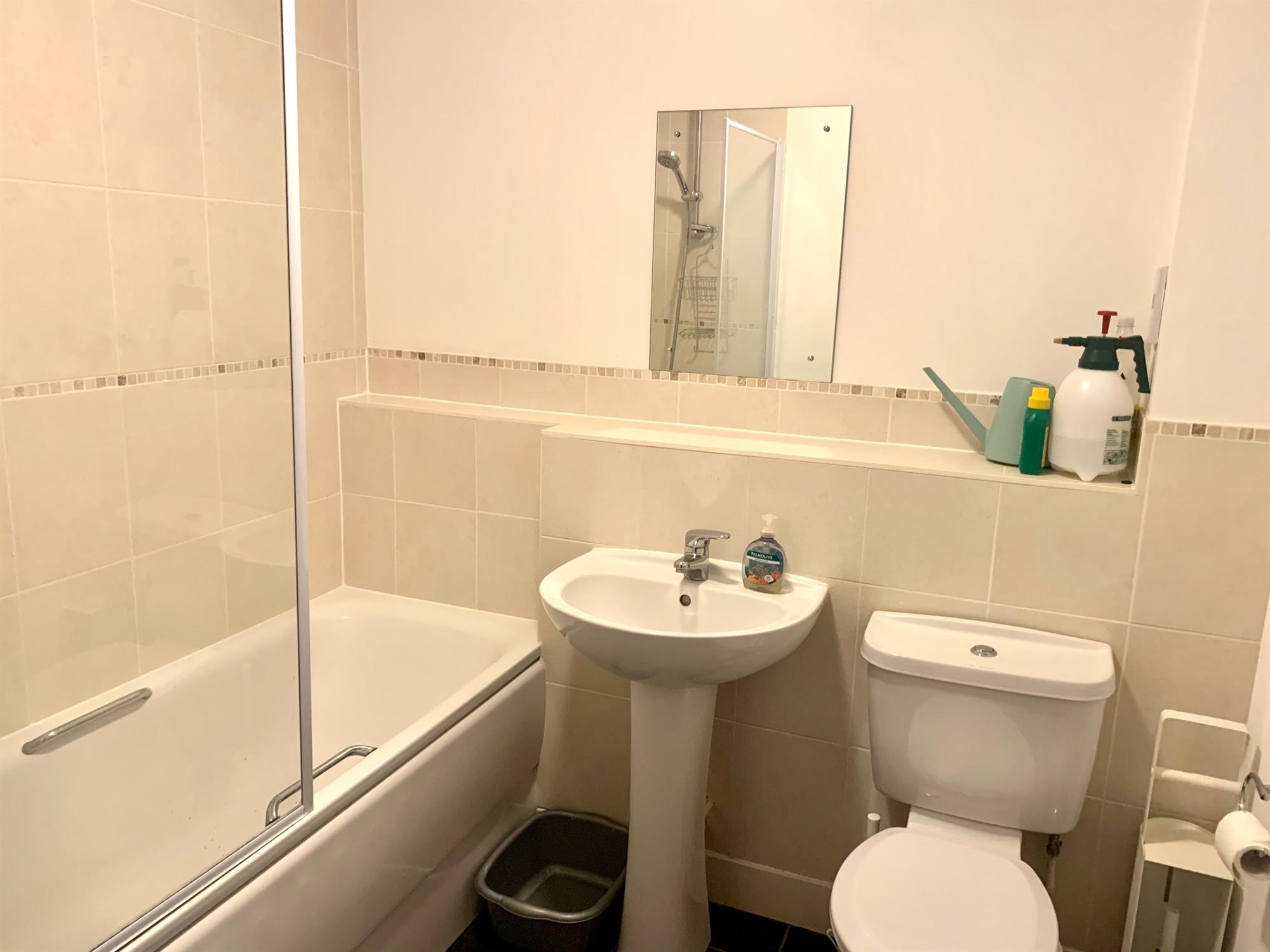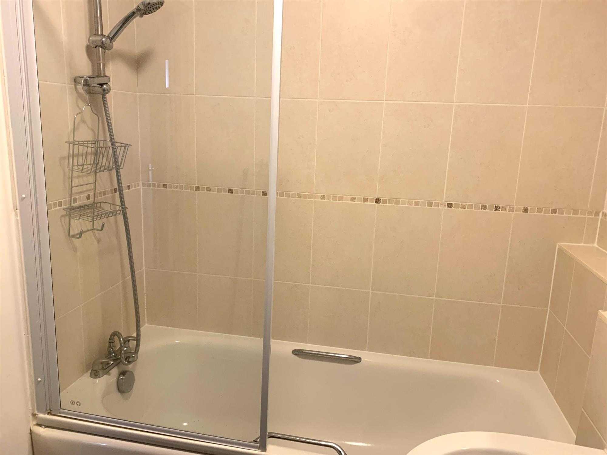 BATHROOM – White suite with bath with shower over, sink and toilet.