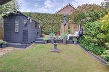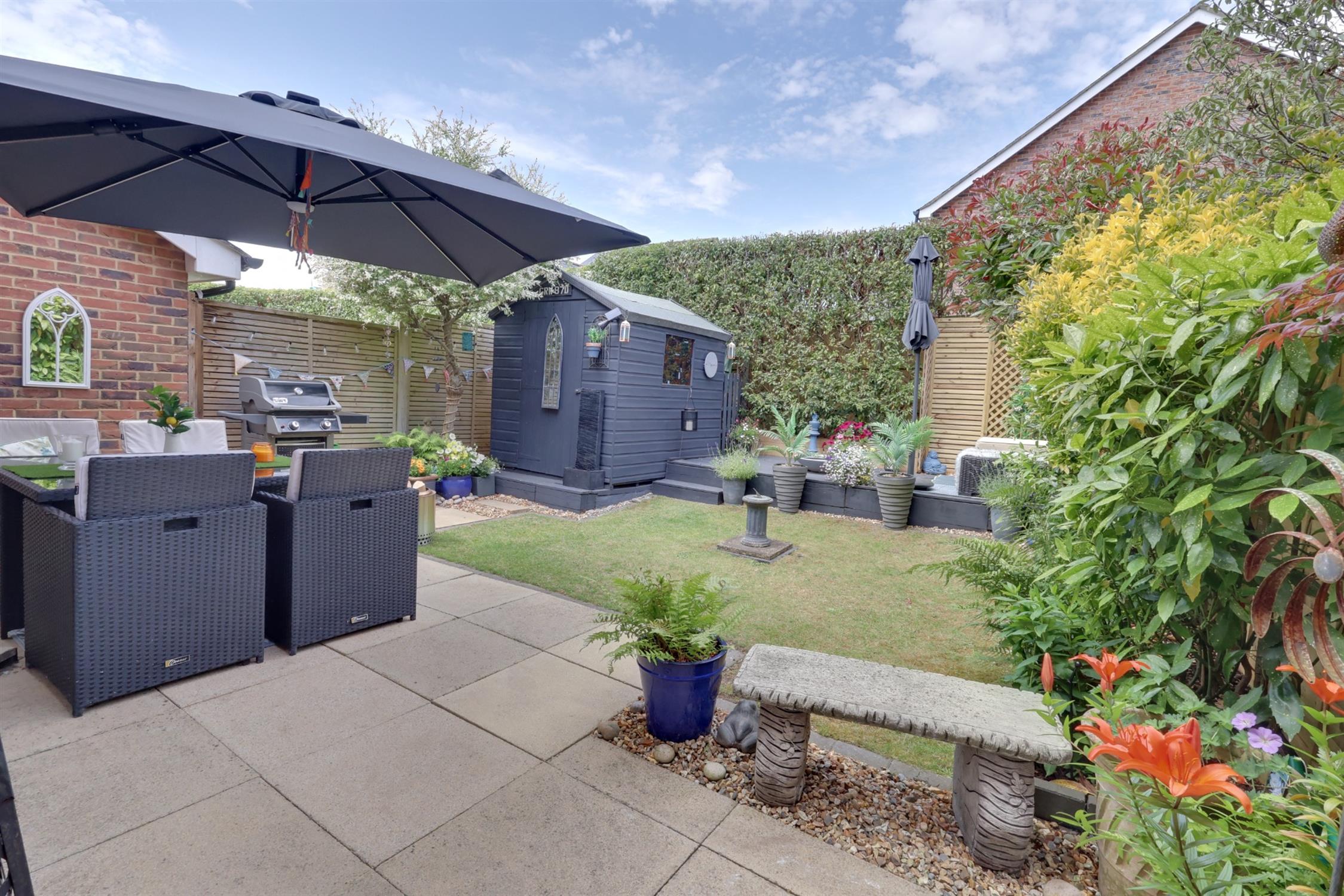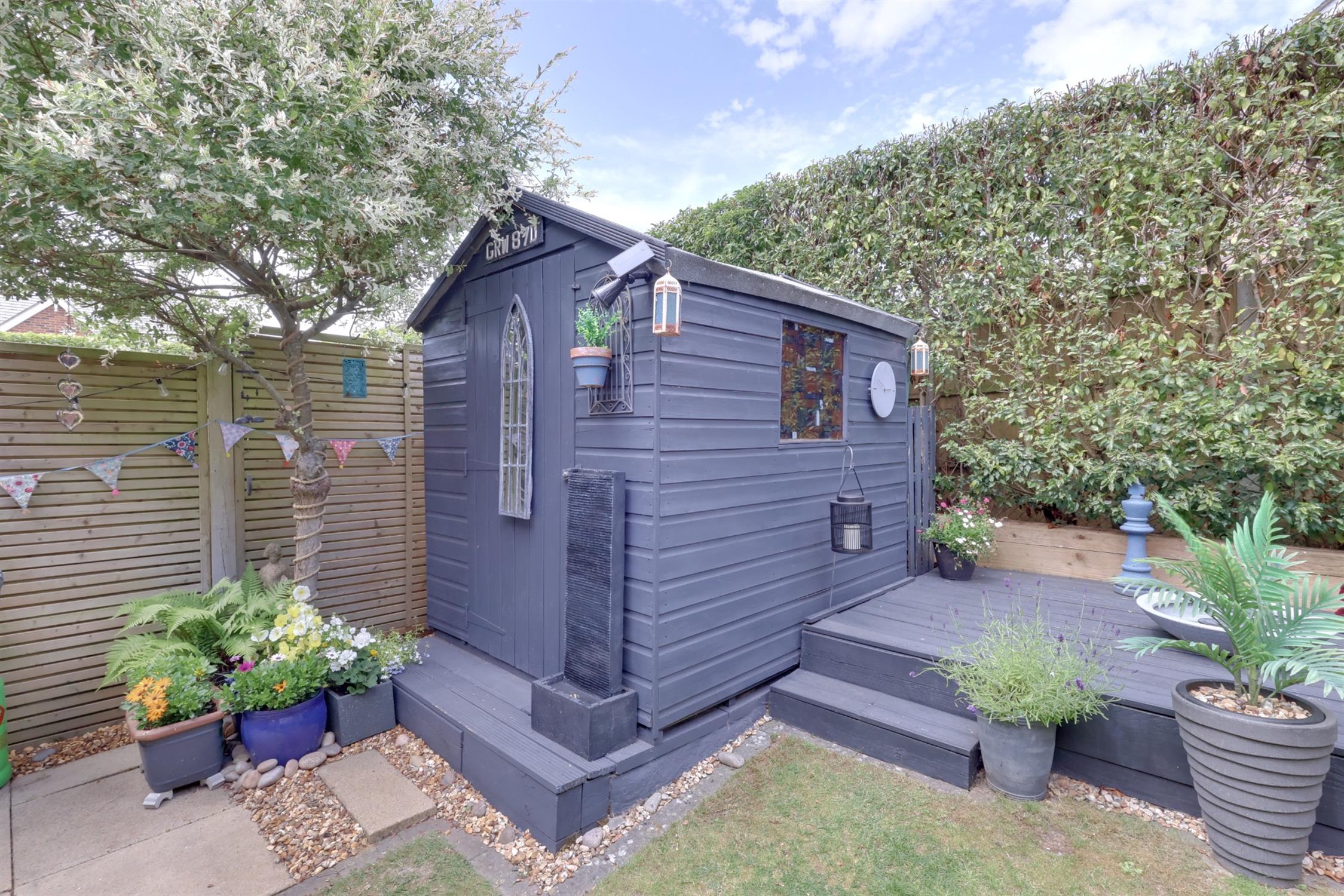 Fully enclosed ornamental garden with paved patio area. Central lawn with colourful raised borders and further raised decking seating area with water feature. Timber garden shed with mains supply for freezer/dryer. Gated side access to front.