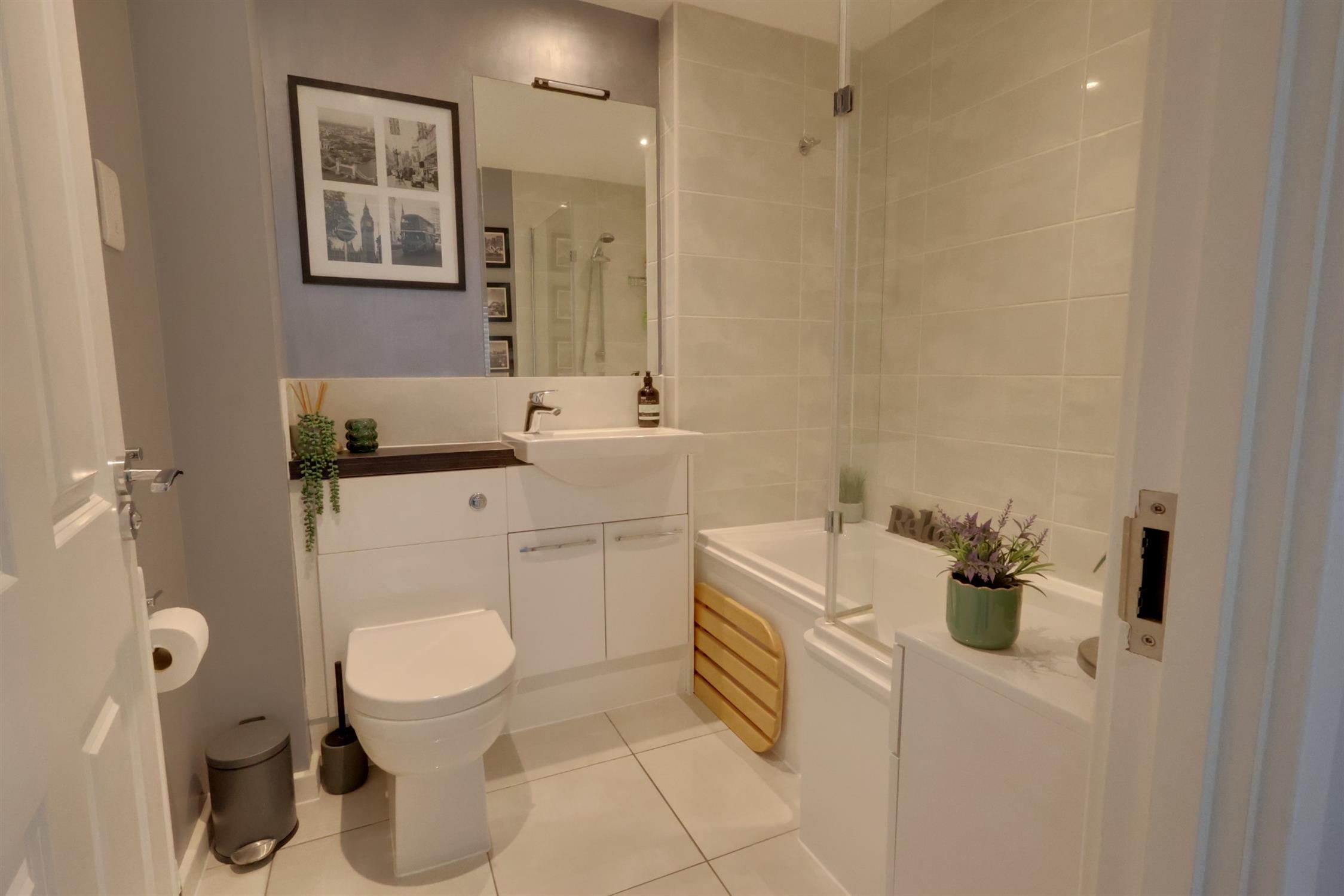 Panel bath with mixer tap and shower attachment. Wash basin in vanity surround with mirror over. Close couple W.C. Shaver point. Extractor fan.