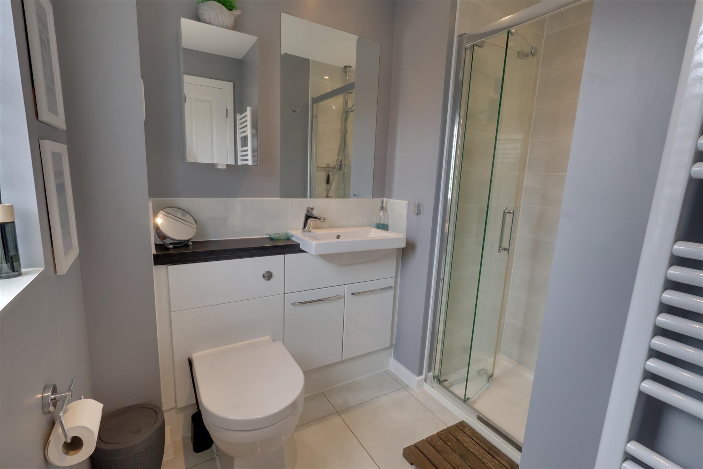 Step in shower cubicle. Wash basin in vanity surround with mirror over. Close couple W.C. Ladder style radiator. Obscure double glazed window.