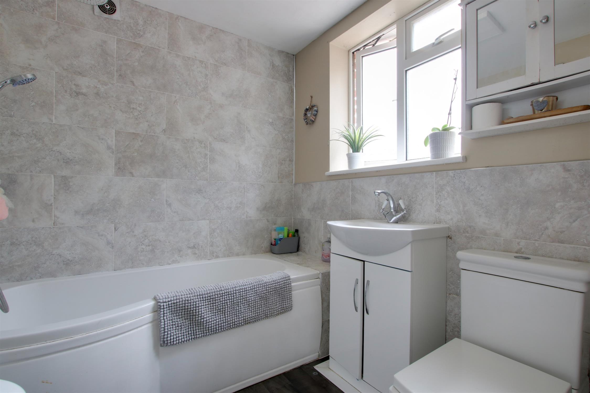 Double glazed window to rear elevation. Shower bath with shower unit over with monsoon shower head. Vanity unit with wash hand basin and storage beneath. Low level close coupled WC. Heated towel rail. Part tiled walls. Extractor fan.