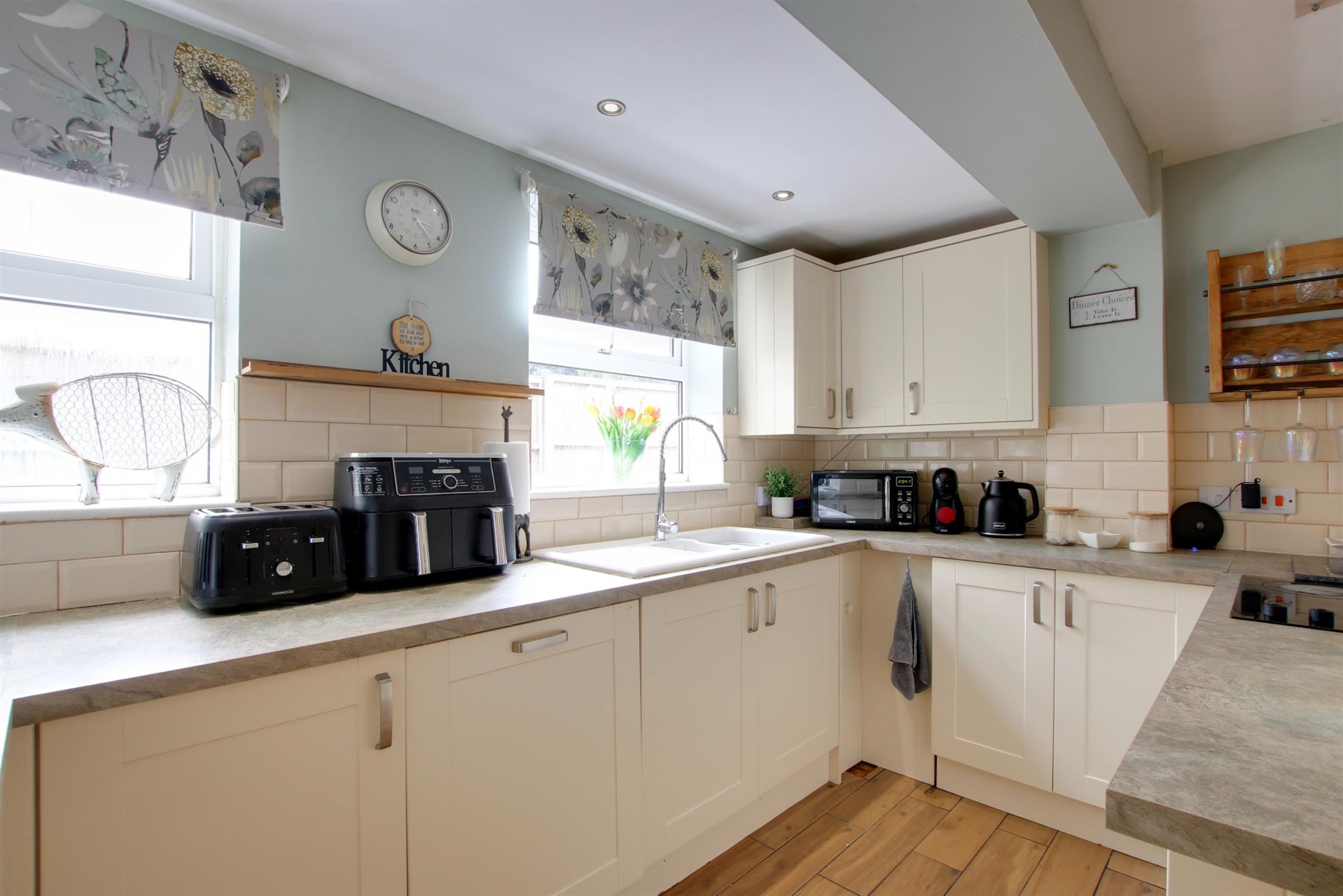 Two double glazed windows to side elevation. White enamel one and a half bowl single drainer sink unit with cupboard under. Further range of wall and base level units with work surfaces over and splash back tiling. Built-in four ring ceramic hob with drawers below. Built-in double oven with cupboards under and over. Built-in and concealed dishwasher and fridge/freezer. Base level boiler. Inset ceiling spotlights. Doorway to: