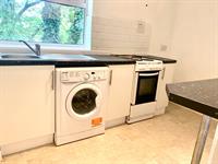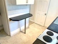 A range of wall and base units with a breakfast bar with a window to the side. Appliances consist of a washing machine and an electric oven and hob. There is space for a fridge/freezer and a handy storage cupboard.